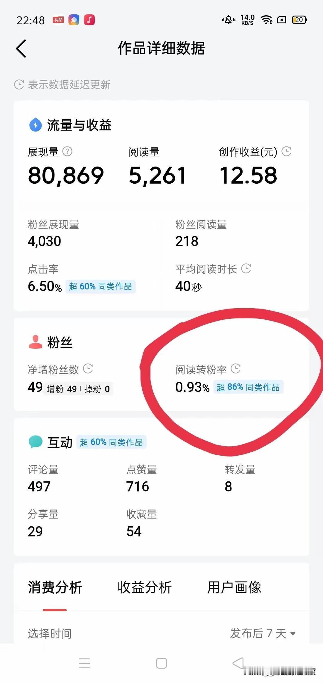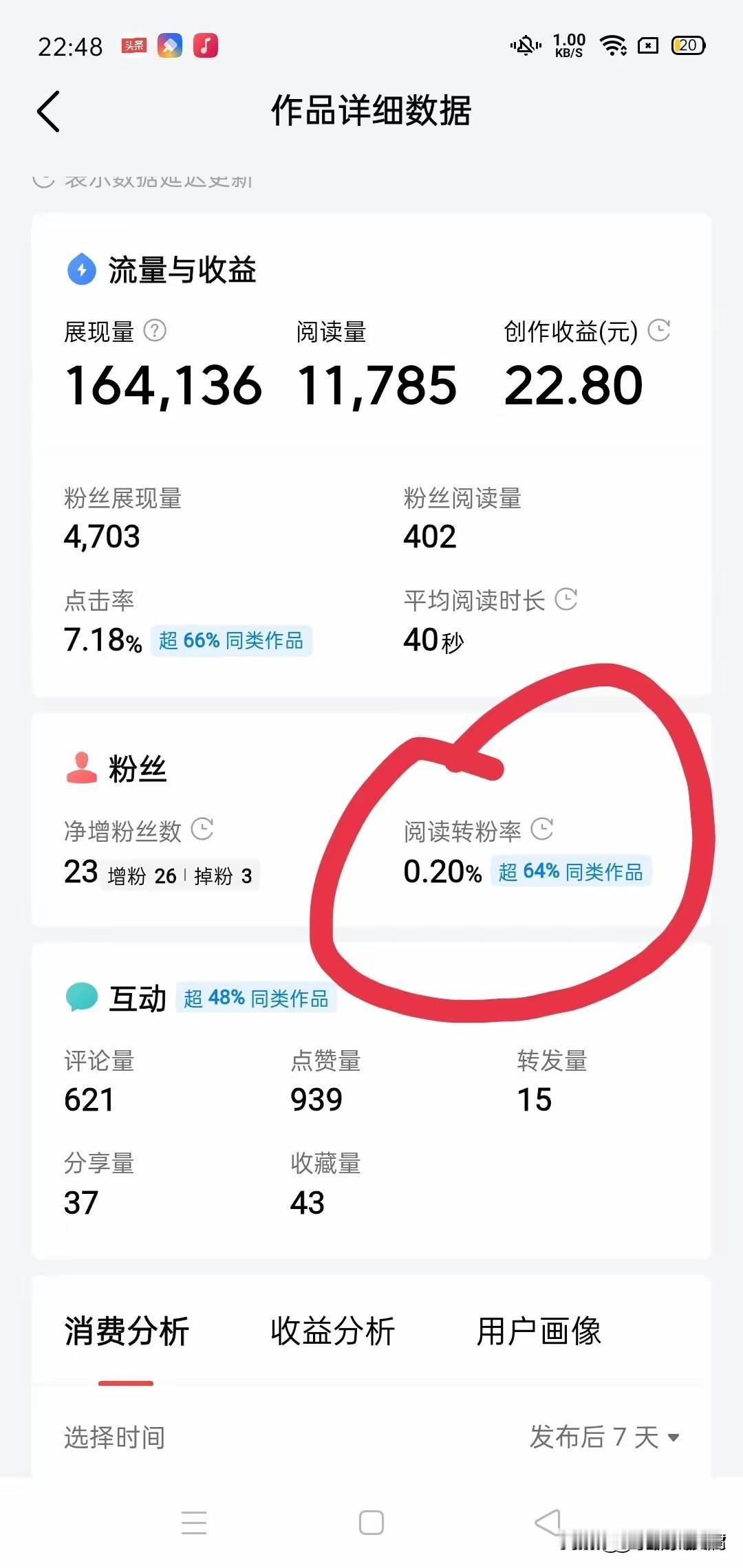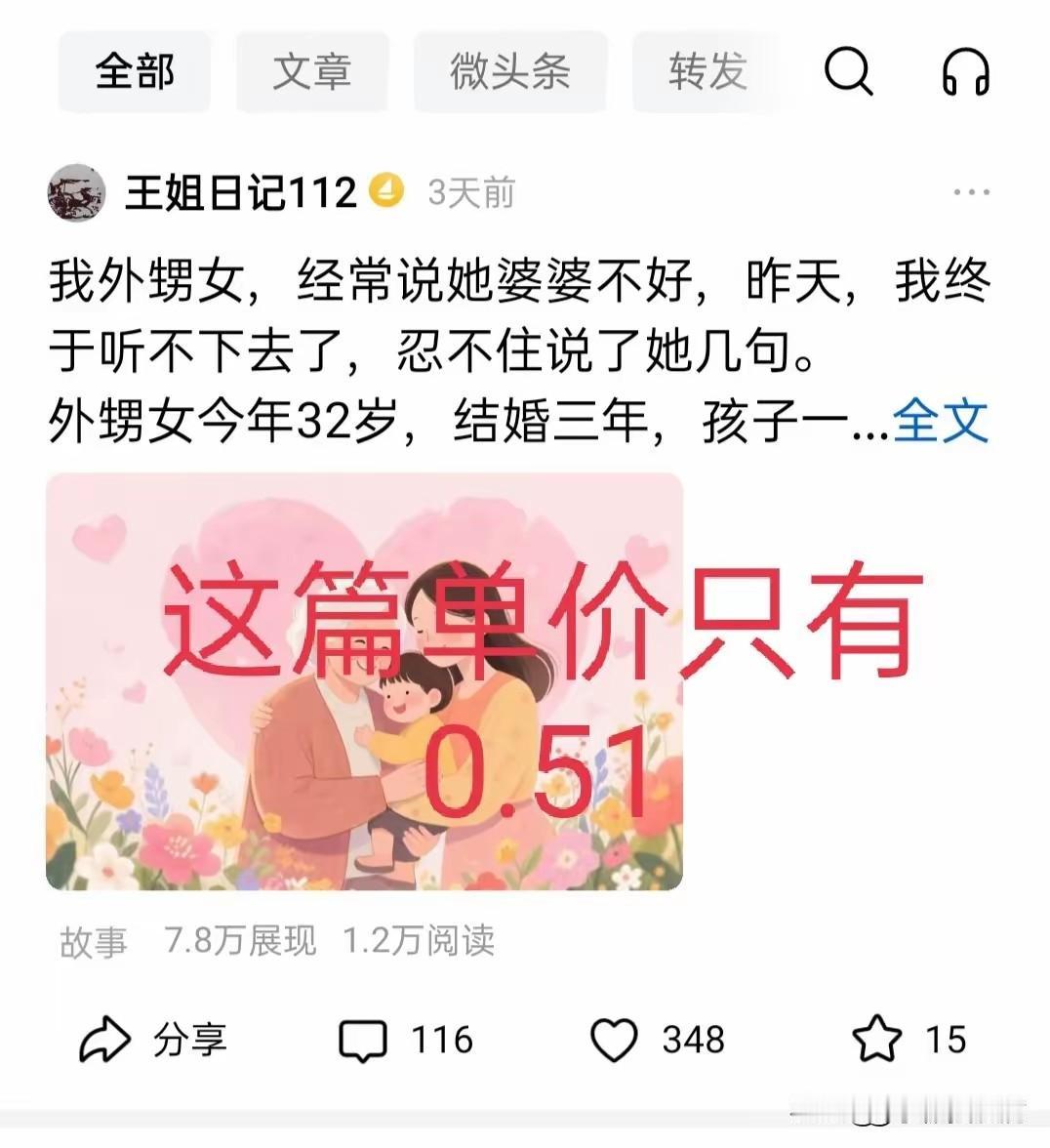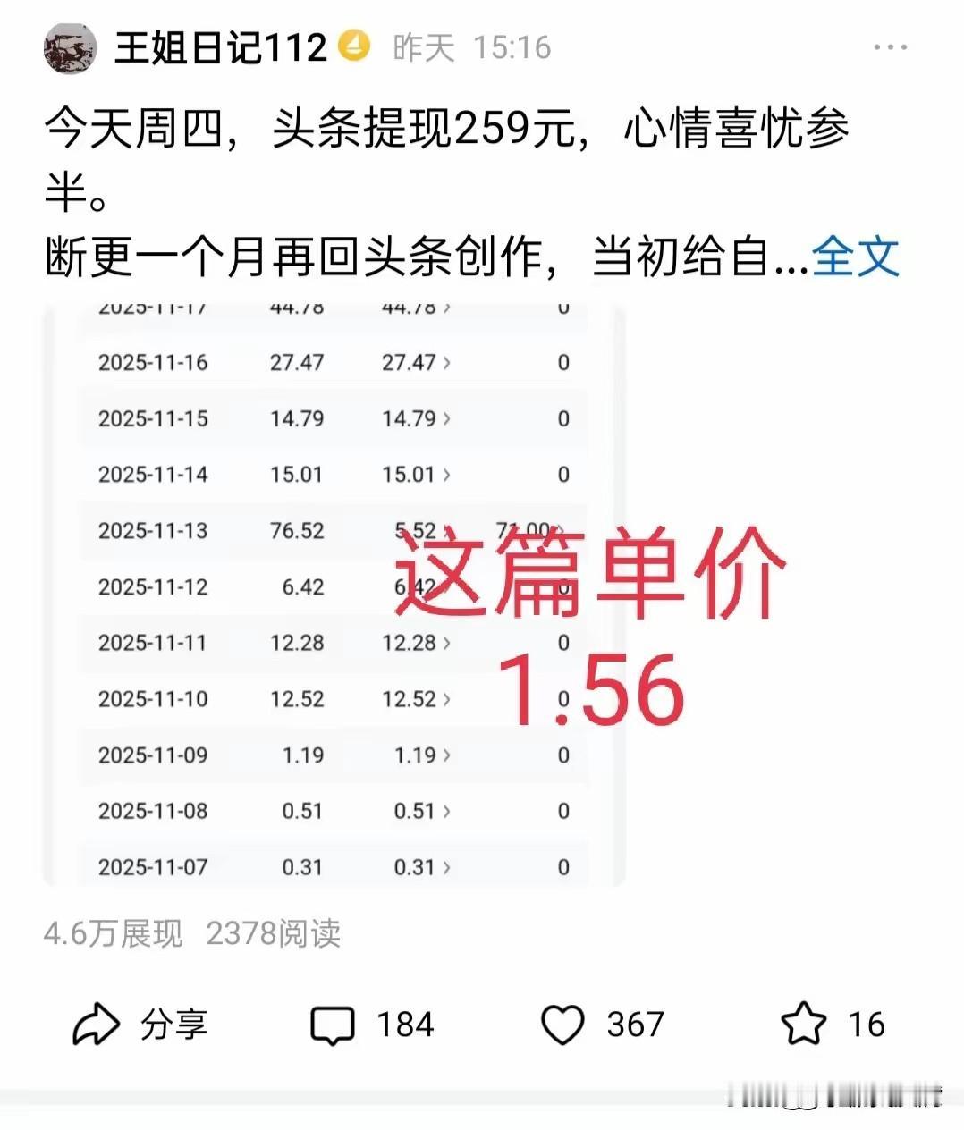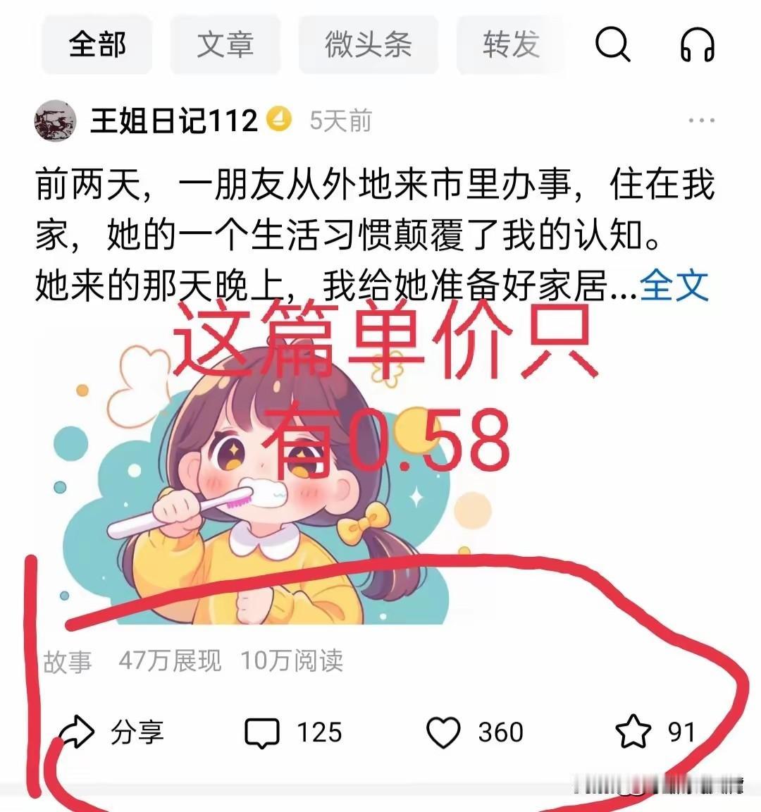 来头条创作900多天,收益8.3万,我通过对数据的精准分析,掌握了提高单价的秘密,迫不急地想分享给大家。这让我开始研究数据,原来单价高低和好多因素有关。前两天分析了半个月写的60多条,发现一些规律。 系统给的单价每天不一样,同一天写的内容可能差很多。不是说看的时间长单价就高,主要是评论、转发这些互动数据更重要。比如有篇阅读8千多的文章,单价2.39元,光靠这49个粉丝就帮了大忙。另一篇评论点赞都不少,但转粉率太低,单价直接掉到1.94。 最离谱的是那篇十万阅读量的爆文,赚了不到六十块。后来发现转粉率只有0.1%,连0.2%都不到的文章都不如。原来单价主要看几个指标,收藏、分享多的,转粉率高的,内容正能量或者能引起争议的,都能让钱多一点。 怎么提高转粉率呢?我发现写些有争议的话题,或者能让大家有共鸣的内容,容易留人当粉丝。比如昨天发了篇关于养宠物的,问大家要不要在家养狗,评论直接炸了,点赞也比平时多。转粉率涨到了0.6%,单价跟着上去了。 阅读时间长短也有讲究,同样点赞数的情况下,看文章时间越长,单价越高。这说明内容要让人愿意花时间读完,不能一扫而过。我最近试着把重点放在后半段,这样即使前面没多少人看完整篇,但能留下来的粉丝质量更高。 原创度也不能忽视,平台给高分的原创文章,单价基本比普通内容多0.1到0.2。所以现在写完都会检查检测,尽量用自己的话说,少复制别人的内容。 还有个发现,下午三点发文章转粉率好像高点,可能大家下班前有空刷。评论区多放问题,让大家回复,也能增加互动。像我之前总自己写评论,现在改成直接问读者意见,反而粉丝增长快了。 平台标签挺有用,比如这次用的冬日生活打卡季,流量确实比平常多。但主要还是内容本身得符合要求,标签只是加分项。现在写完了会先看看类似文章,哪些标签下同类内容受欢迎。 总结下来,单价就是评论、转发、转粉率在说话。爆款文章看数据不一定赚钱,关键要让读者觉得值得收藏或者分享。我接下来计划多关注转粉率,把之前写的高互动内容再整理一遍,找找规律。 就这样,想看数据详情的可以翻我之前的图,不想看的就走吧。自己琢磨出来这些,感觉比乱猜有用多了。