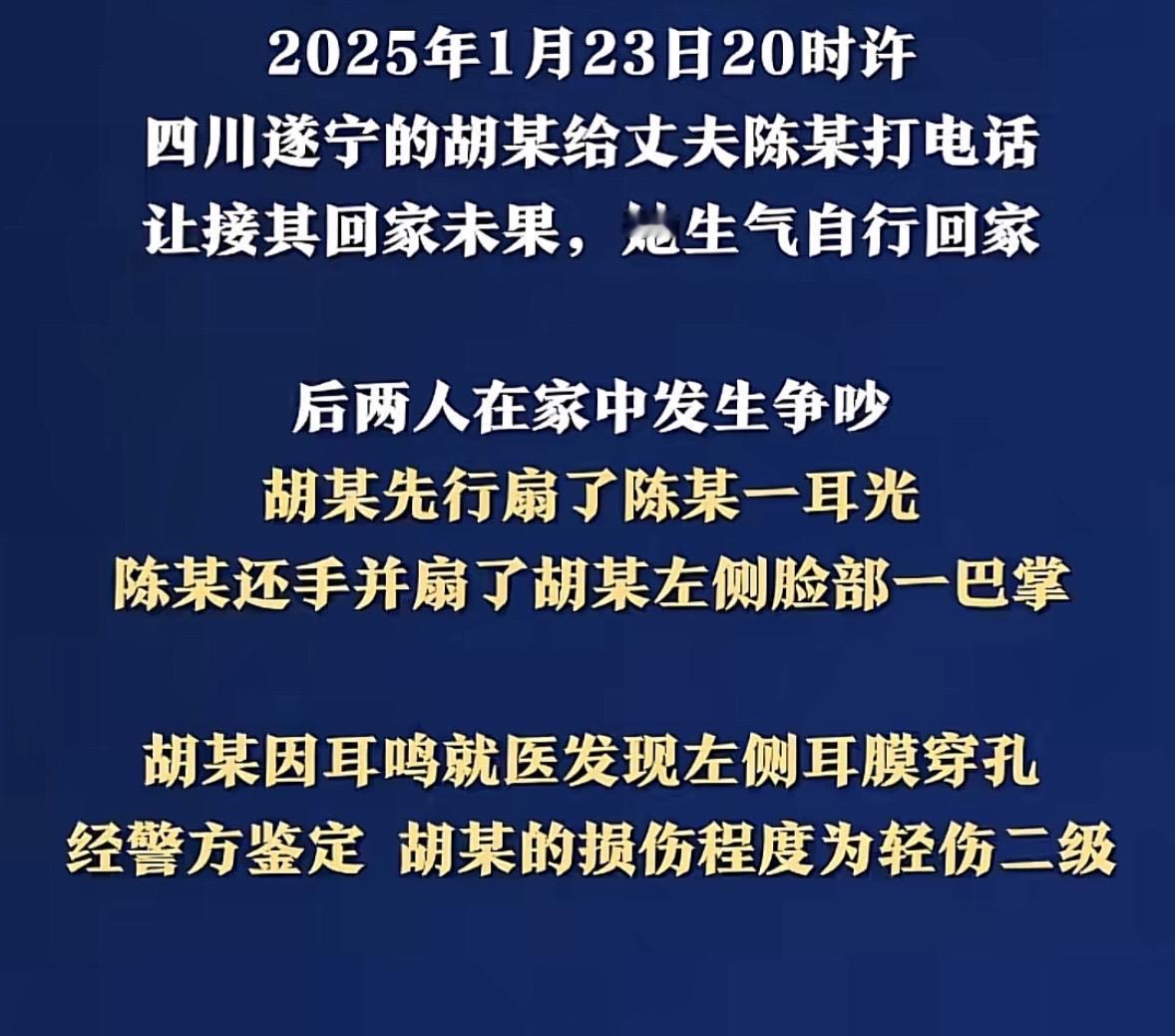 “冤不冤?”四川遂宁,女子打电话让丈夫接她下班,可丈夫却没接,女子心里憋了股火,回家后和丈夫大吵一架,争执中,女子扬手给了丈夫一巴掌,没想到,丈夫反手还了她一巴掌,还把她打成耳膜穿孔,经鉴定为轻伤二级,这下性质彻底变了,检察院认为应该以故意伤害罪追究丈夫的刑事责任,可丈夫一方认为这是正当防卫,顶多算防卫过当。法院判决出乎意料! 2025年1月23号晚上8点,胡某站在公司楼下,搓着冻红的手给丈夫陈某打电话。 她等公交等了半天都不来,天冷得实在遭不住了,就想让丈夫开车过来接她。 然而,几通电话打去,却始终没人接,这让胡某十分火大,心里那股子火噌地窜了上来。 她心想:这陈某到底干啥呢?怎么偏偏在她需要的时候联系不上?要这丈夫有啥用啊! 等胡某回到家,过了一阵,丈夫陈某也回来了,胡某脸一黑,开始找丈夫算账。 她噼里啪啦一顿输出,说这大冷天的,我想着让你开车接我一下,你倒好,死活不接电话,你咋老是关键时候掉链子? 陈某无奈解释,说自己也有工作在身,没注意手机,你自己打个车回来不是一样的吗?至于吗? 这句话瞬间点燃了胡某的怒火,她为了省钱,压根不舍得打车,平常能坐公交就坐公交,她为了啥,不就是为了这个家吗? 两人你一句,我一句,吵得不可开交。 胡某一气之下冲上去,抬手就往丈夫脸上甩了个耳光。 "啪"的一声脆响,陈某的脸偏向一边,嘴角火辣辣地疼。 你敢打我?陈某摸着发烫的脸,眼睛瞪得通红。他猛地站起来,抡起胳膊反手就是一巴掌。 这一巴掌用足了力气,胡某只觉得左耳嗡的一声… 她踉跄着扶住墙,眼泪刷地流下来,不可置信地说:你……你打我? 陈某喘着粗气,指着她吼:再闹试试! 胡某被打后上去对着陈某继续抓扯,后来被家里人拉开后,才停止了这场闹剧,陈某心里也堵得慌,直接摔门离去了。 第二天早上,胡某的左耳还在嗡嗡响,像塞了团棉花。她请假去了医院,检查结果让她愣住了。 丈夫这一巴掌,竟把她打到耳膜穿孔。 胡某摸着肿起的脸,越想越委屈。当初恋爱时,陈某连她咳嗽一声都要紧张半天,现在居然敢对她下这种狠手! 鉴定显示,胡某的耳膜穿孔属于轻伤二级,这已经触犯了刑法。 检察院认为,陈某故意动手把媳妇胡某打成轻伤二级,得按故意伤害罪治他。 开庭时,陈某自己认了,说对检察院说的罪名、事实和量刑建议都没意见,还签了认罪认罚的字据,庭审时也没反驳。 不过,陈某的律师认为,这是夫妻吵架引发的,胡某先动手打的陈某,陈某后来还手算是“正当防卫”,顶多算“防卫过当”,应该轻判甚至判缓刑。 那么,从法律角度来看,陈某的行为是否构成正当防卫? 《刑法》第234条规定:故意伤害他人身体的,处三年以下有期徒刑、拘役或者管制。 胡某左耳膜穿孔经鉴定为轻伤二级,符合“故意伤害致人轻伤”的法定情形。 法官审理认为,陈某虽称“她先动手”,但他的反击行为并非本能躲避或制止,而是主动发力击打特定部位,符合“明知会致伤仍实施”的故意伤害主观要件。 报告明确耳膜穿孔由陈某的巴掌直接造成,排除其他致伤可能,形成完整因果链条。 胡某的首次耳光虽属家庭纠纷中的轻微暴力,但侵害已随动作结束而终止。陈某的反击属于事后攻击,不符合“正在进行的不法侵害”要件,所以不构成正当防卫。 法官指出,正当防卫,指得是正在进行的不法侵害,她打你一巴掌后,侵害已经结束了,你这时候还手,那就属于故意伤害了。 胡某坐在原告席上,听着这些法律术语,心情复杂,好好的夫妻,现在却要坐在法庭上对簿公堂… 不过,法律不讲人情,证据链完整,陈某的行为已经构成故意伤害罪。 不过法院也考虑到陈某是主动投案,老老实实交代了事情经过,属于自首,可以从轻发落。再加上他认了罪认了罚,法律上也给从宽处理。 最终,法院判决陈某拘役6个月。 这个案子,也折射出一个典型的认知误区,那就是“不是谁先动手谁有错”。 胡某虽然先动手,但法律评价需区分“事出有因”与“正当防卫”。本案中,陈某的过度反击超出合理限度,所以需要独立担责。 综合来看,案子是因为夫妻矛盾起的,但动手打人致轻伤就是犯法,得担刑责。 简单说,夫妻吵架归吵架,动手就得负法律责任。陈某这事儿,哪怕先挨了一下,也不能以牙还牙下狠手,法律可不认这种互相伤害。 有人认为,此案判决有失偏颇,男方因女方先动手打人,不得不还击,只是失手致女方受伤,并非故意,只能说过失致人受伤。 两口子困索碎事吵架依正常,老婆打了老公一巴掌,这位老公还真下得去狠手,一巴掌打出来一个轻伤二级,这也太厉害了,怎么一点夫妻情面也不讲,生活之间的小事因为动手,处犯了刑法,被拘役六个月,出来后,夫妻还能合好吗?真是一个沉痛的教训。 对此,你怎么看? 关注@运良说法. 学法律知识不迷路