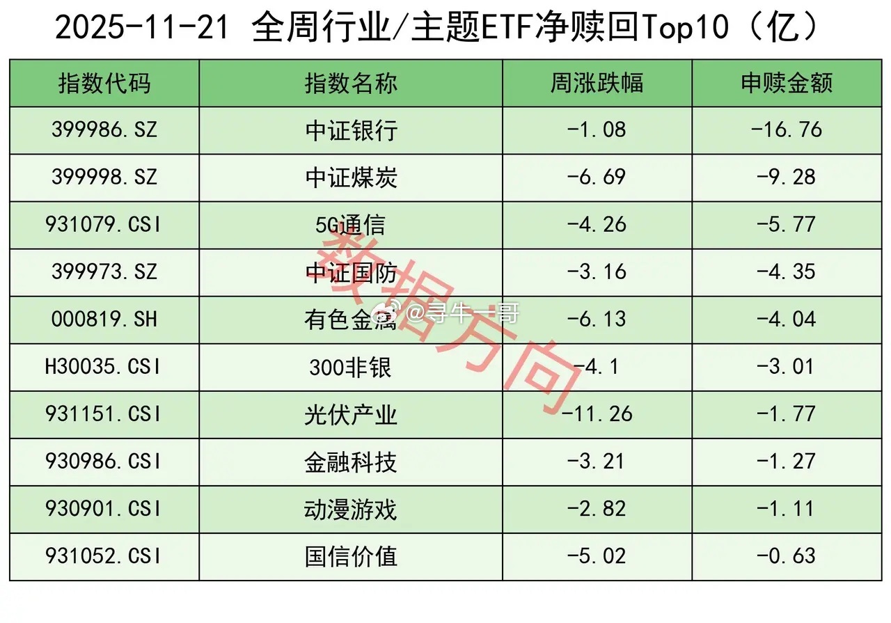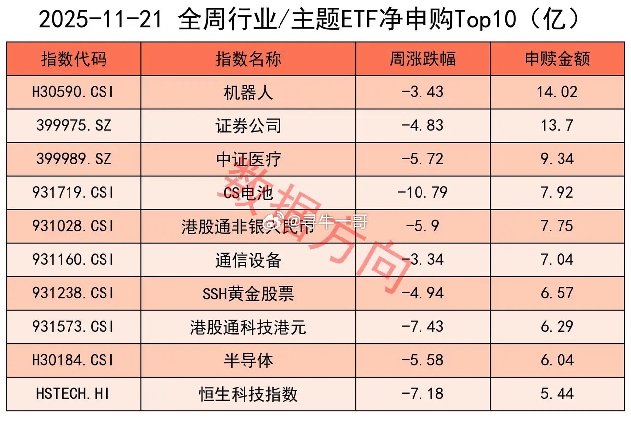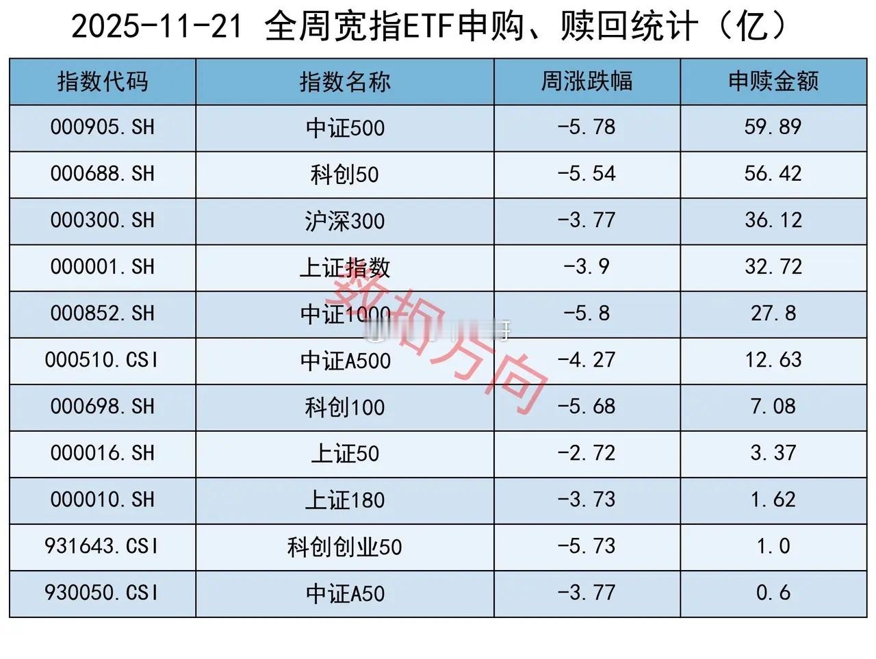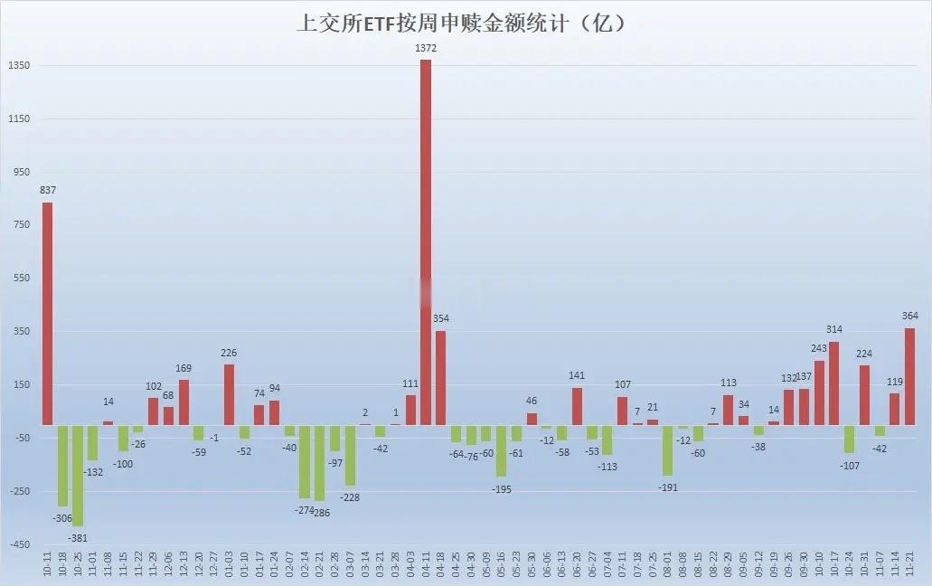 神秘资金本周流入364亿!本周,上证指数跌幅3.9%,上交所股票型ETF净申购364.25亿。比较巧的是:上次单周跌幅超过3%,发生于4月7日上证指数见底3040点的那一周;上次单周净申购金额超过本周的,同样也发生于4月7日那一周的1372亿元。ETF正发挥着类似平准基金的作用,下跌的时候通过申购注入流动性,上涨的时候就少申购甚至赎回,以此来平抑波动。本周五个交易日的净申购、净赎回金额依次分别为:68.05亿、(-3.36亿)、6.6亿、32.78亿、260.18亿。除了周二小幅净赎回,其他4天全部净申购,尤其是周五大盘重挫的当天,单日净申购260.18亿。上次单日净申购高于今天,同样是大盘见底的4月8日净申购的832.42亿。所有宽指本周全部获得净申购:中证500、科创50,净申购分别高达59.89亿、56.42亿。沪深300、上证指数,分别净申购36.12亿、32.72亿。中证1000、中证A500,分别净申购27.8亿、12.63亿。科创00、上证50、上证180、科创创业50、中证A50等,净申购都在10亿以内。行业和主题本周的申购榜和赎回榜都比较散乱,大家自己看看就好。