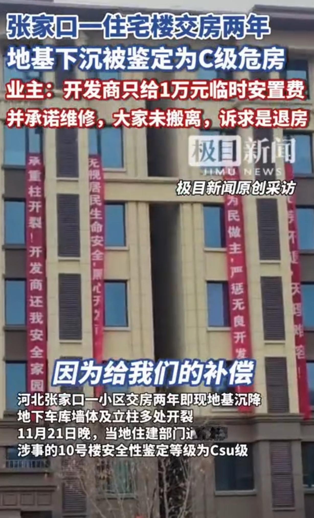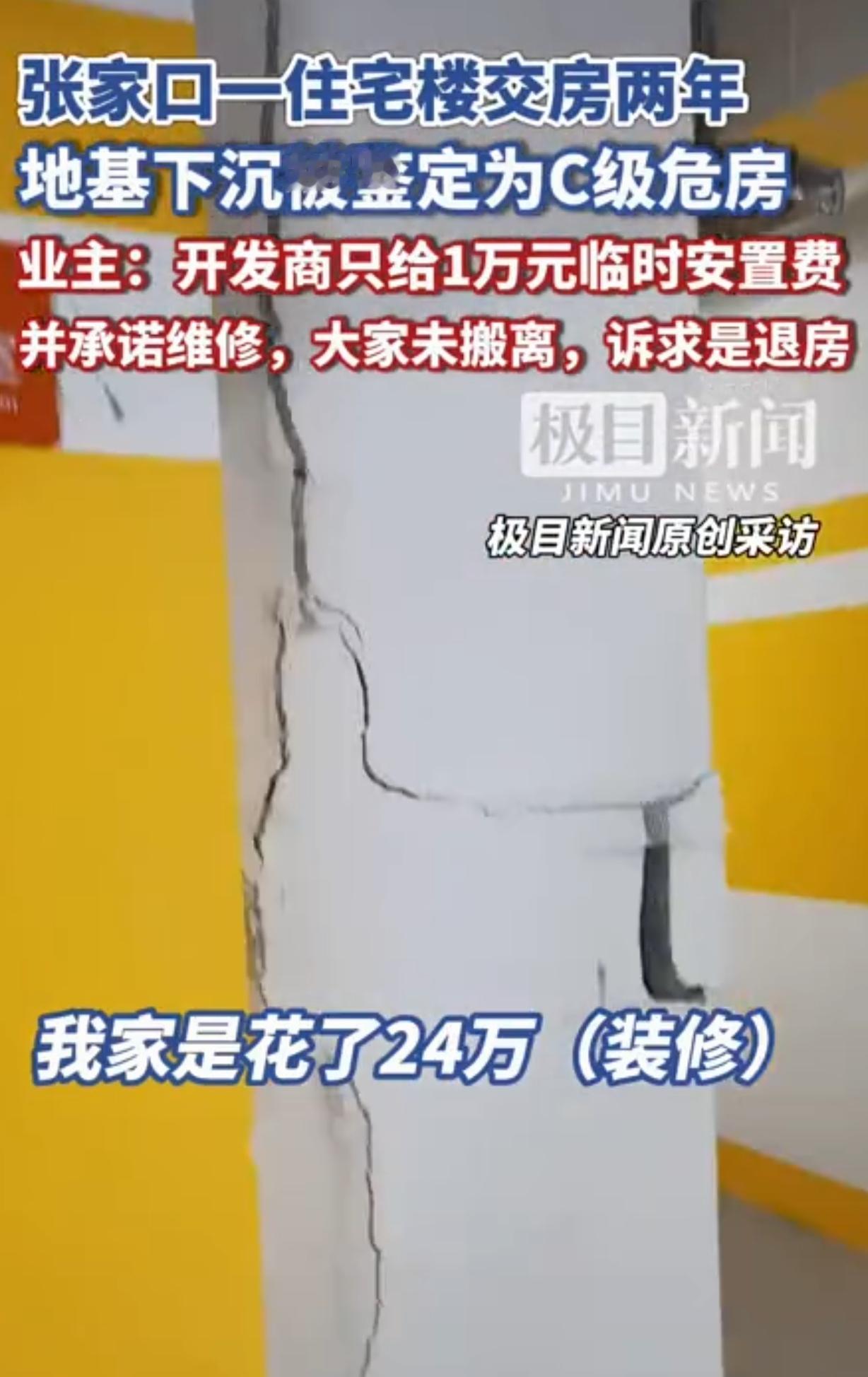 河北张家口,一女子花42万买了一楼,又花24万装修,可把她吓得不轻的是,她才住了2年,房子的地基就下沉,地下车库和立柱全裂出大口子,被鉴定为C级危房,但开发商每家每户只给了10000元安置费,承诺维修,业主们都没搬,压根不领情,诉求就是维修不好使,必须退房! 一女子拿出攒了半辈子的42万,终于买了套房,结束了租房度日的生活。 以前房价太高买不起,如今房价下来了,而她手里正好有点积蓄,她觉得房价再跌,也跌不到哪里去了,此时出手是最好的时机。 毕竟,她看够了房东的脸色,人家说房子不租了,她就得屁颠屁颠去找房,每次搬家,都累的她精疲力竭,这种租房的日子,她过的是够够的。 谢天谢地,房价下来了,小区的户型,位置,配套,绿化,还有价位,都让她非常满意,她和家人一商量,立马支付全款拿下了房子。 为了让一家人住的舒服些,女子在装修上也没省,一共花了24万,房子装的看起来大气温馨,散味后,一家人兴高采烈乔迁新居,从此安居乐业。 可让女子万万没想到的是,才交房两年,一家人住进去也就一年多,她10号楼的房子竟然地基下沉,地下车库墙体和立柱裂开了大口子,看着触目惊心。 最终,10号整栋楼被鉴定为C级危房,居住风险非常大,随时都可能有安全隐患。 10号楼的业主,包括女子在内,都吓得不轻,这可不是闹着玩的,说不定哪一天睡到半夜,楼房就坍塌了,一栋楼里的无数条生命,就可能葬身在砖头瓦砾里! 可业主们并没有立马搬走,因为他们对开发商处理问题的态度非常不满。 开发商每家每户只给了10000元安置费,承诺会维修房子,就想把业主们打发了。 这点钱够干嘛的呀?楼房是地基下沉,房子都盖出来了,地基没打好,怎么维修?即使暂时稳固住了,早晚都是隐患。 业主们才不领情呢,在他们看来,整个10号楼业主,买房的金额从40万到50万不等,再加上十几万二十多万的装修,可以说是大家一辈子的积蓄,就买了这么个破房子,随时都可能出危险。 大家统一的诉求就是退房子,其他解决办法一概不接受。 在业主们看来,房子应质量问题,开发商应无条件回购,建房监理和质监都有责任。当初整个链条上的人应该严查,如果不严查,那就说明问题大了。 法律对开发商无效吗?为啥老百姓买到烂尾楼,质量差的房子就束手无策呢?法律的公平公正呢? 攒了半辈子的钱,换来一栋要命的楼! 这女子太不容易了!攒了半辈子钱,42万全款买房,又搭进去24万装修,本以为能安安稳稳过日子,结果住了两年,楼就塌了——不是全塌,是地基下沉、墙体开裂,整栋楼成了“C级危房”! 这哪是住人啊?指不定哪天半夜就塌了,一家老小的命命悬一线! 最气人的是开发商的态度!每家只给一万块安置费,说“修修就行”。 一万块够干嘛?地基都没打好,修了能管用?今天修好,明天又裂,这不是拿人命开玩笑吗?业主们不搬,不是不想活,是咽不下这口气,半辈子积蓄,加上装修钱,少说六七十万,就买了这么个“危房”?这钱是大风刮来的? 业主们的要求不过分:退房!不要维修,不要敷衍,就要退钱!这楼住不了,修不好,留着干啥?等死吗?可开发商呢?装聋作哑,推卸责任,好像业主们的命不值钱似的。 说到底,这事儿不光是房子的问题,是良心的问题!买房是老百姓的头等大事,一辈子可能就这一套房,结果遇上这种黑心开发商,偷工减料,敷衍了事,把好端端的楼盖成“危楼”,这不是害人吗? 现在业主们只能硬扛,不搬、不妥协,因为他们知道,一旦松了口,这辈子的血汗钱就打了水漂。可他们又能扛多久?开发商拖得起,他们拖不起啊! 真心希望这事儿能有个说法,别让老百姓寒了心!买房图个安心,结果买来个“定时炸 弹”,这日子还怎么过? 《最高人民法院关于审理商品房买卖合同纠纷案件适用法律若干问题的解释》第13条规定:因房屋质量问题严重影响正常居住使用,买受人请求解除合同和赔偿损失的,应予支持。 案涉房屋因地基下沉、墙体开裂被鉴定为C级危房,意味着房屋结构已严重受损,随时可能发生坍塌,直接威胁业主的生命安全,这不是“墙面掉漆”“水管漏水”等轻微质量问题,而是彻底摧毁了“居住”的核心功能,居住的前提是“安全”。 业主的“退房”诉求合法,根据上述条文,当房屋质量问题严重到无法安全居住时,业主有权解除购房合同,即“退房”,并要求开发商赔偿全部损失,包括购房款、装修费、因无法居住产生的临时安置费等。 开发商的“维修+一万元安置费”为何不合法?维修无法解决地基下沉的根本性安全隐患,地基是房屋的“根”,根坏了再修也只是“表面功夫”,一万元安置费更是远不足以覆盖业主因无法居住产生的实际损失,比如租房成本、精神压力等。开发商的敷衍行为,本质是逃避法定的“解除合同+赔偿损失”责任。 所以,业主的必须退房诉求,不是无理取闹,而是法律赋予的生存权保障。 关注@灋律盐究员 学法辩是非,用法止纷争。