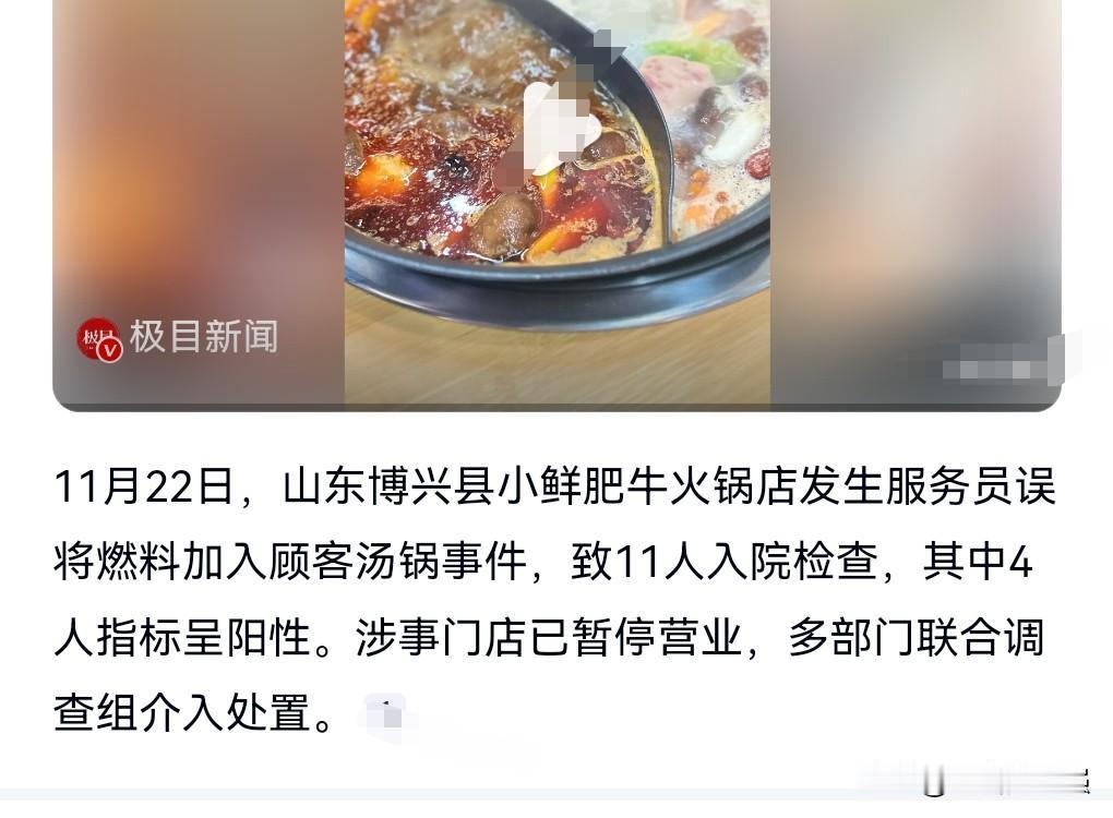 这真是太粗心大意,近日,山东,一火锅店服务员误将燃料加入汤锅致11人入院检查。 幸亏没有什么生命危险。要不然的话,那就麻烦了。 这起事件实在是太不应该发生了,竟然犯这种低级错误。 那损失肯定要店里赔偿。 目前,门店已暂停营业。