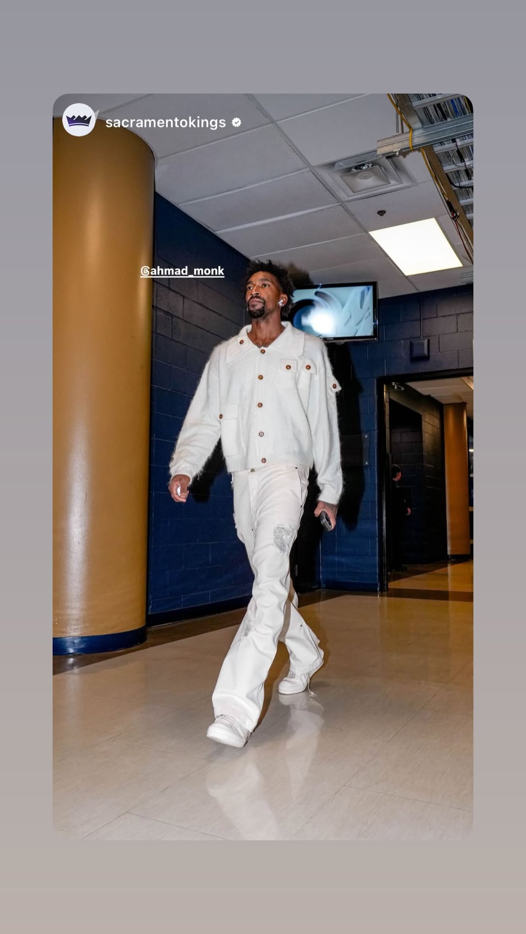虎扑11月23日讯国王球员马利克-蒙克更新个人社媒,晒出今日赛前入场穿搭照片。