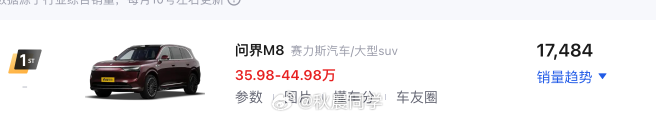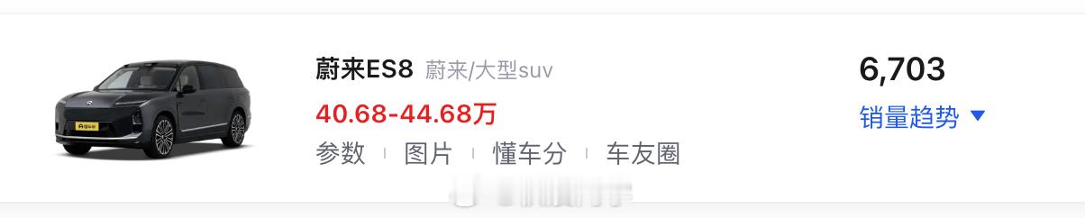 蔚来营销副总裁康凯表示,“11月ES8交付目标希望能到1万台,属于蔚来有史以来产能最快的一台车,12月的产能希望是2万”我查了一下,蔚来ES8在10月交付量是6703台这个目标基本奔着翻倍去了!12月再翻一倍,这目标确实大,我看了下这个价位卖得最好的是问界M8在10月销量是1.7万台