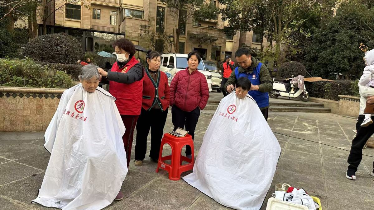 与此同时,广场另一侧的义剪、义诊区域也排起了长队。志愿者们耐心地为老人理发,医务工作者细心地为居民测量血压、视力检测、口腔检查等服务。物业公司还特别安排志愿者为业主准备了姜汤和果茶。