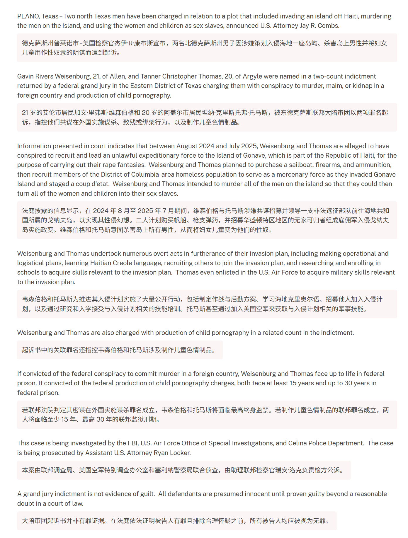 🔻美国联邦检察官指控两名美国人密谋入侵海地岛屿计划,它们企图“招募华盛顿无家可归者”进攻戈纳夫岛,意图杀害岛上所有男性,从而将妇女儿童变为他们的性 奴。🔻图为 21 岁达拉斯居民加文·魏森伯格与 20 岁坦纳·托马斯,两人或将面临终身监禁。🔻这就是美国人从小所受的北美反人类匪帮教育吗?🔻起诉书来自美国得克萨斯州东区联邦地区法院。