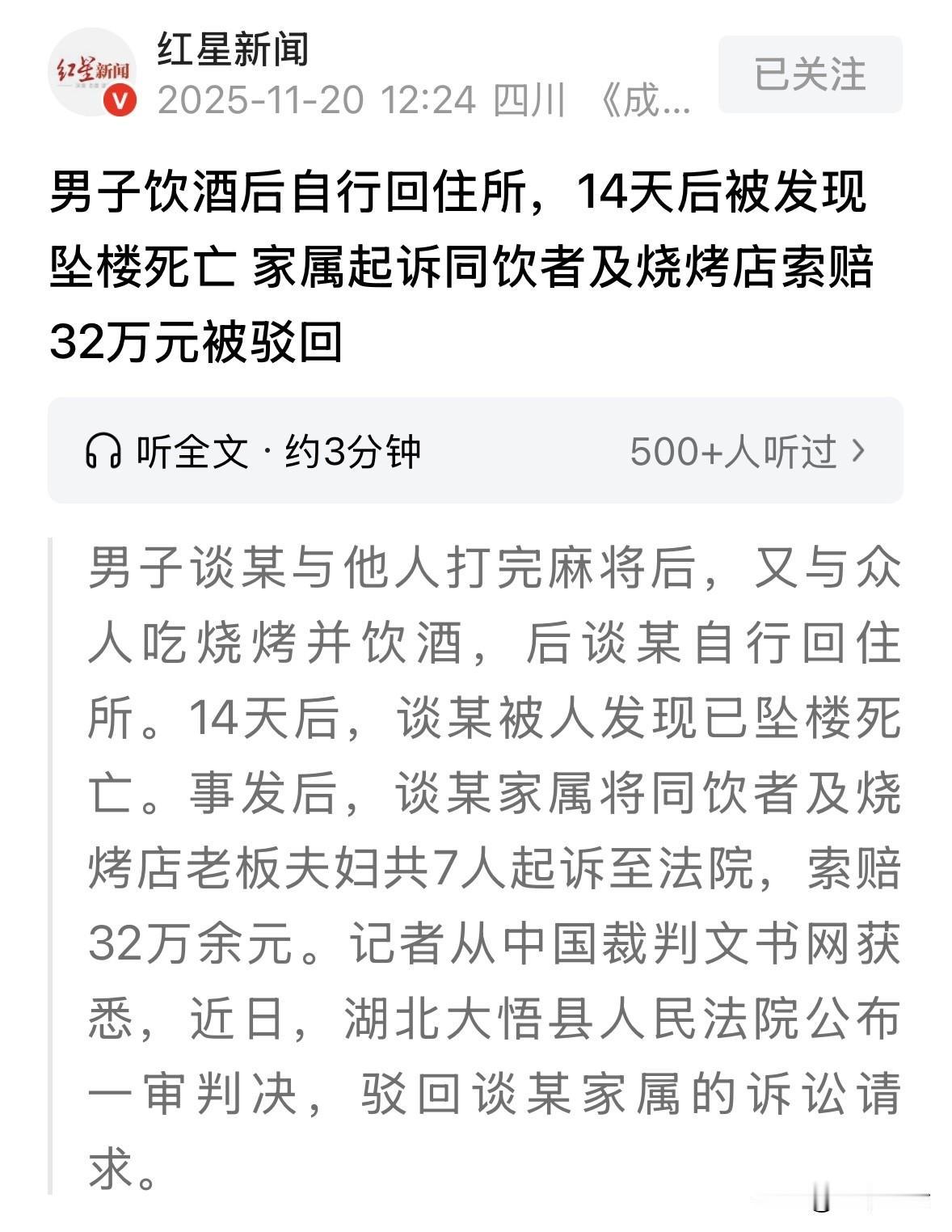 湖北孝感,男子和几个朋友打麻将,结束后,赢钱的朋友请吃饭,6个人一同来到烧烤店,点了一瓶白酒分着喝了,结束后,男子独自回到住所,然而,14天后,一保洁发现男子死在了位于五楼和六楼间的平台上,经鉴定为摔伤致死。事后,男子家属把同饮者,以及烧烤店老板夫妇共7人起诉至法院,索赔32万多,结局亮了。 2024年11月3号晚上,谈某和付某、颜某波、颜某在颜某珍的茶馆打完麻将,颜某珍从赢的钱里抽了200块,说:走,今儿我请客吃宵夜! 旁边看牌的赵某元也跟着凑热闹,6个人晃晃悠悠走进段某国、陈某霞开的烧烤店,点了烤串,又让老板开了瓶大牛栏山白酒。 烧烤店老板娘陈某霞记得,那瓶白酒6个人分着喝,倒也没人喝得东倒西歪。 凌晨一点多,几人酒足饭饱,颜某珍掏了210块结了餐费。 6个人陆续起身离开,谈某走在最后,谁也没看出他有啥不对劲。 谁也没料到,14天后,小区保洁张婶清早扫楼道时,在位于五楼和六楼间的平台上发现了谈某的尸体。 法医来验尸,只说是摔伤致死的,具体咋摔的、啥时候摔的,谁也不知道。 更诡异的是,谈某消失整整14天,家中竟无一人察觉。 事后,谈家人把麻将馆老板娘颜某珍、烧烤店段某国夫妇、四个同桌的人全告了,索赔32万,说他们没照顾好醉酒的谈某,才导致人摔死。 这下,几个人彻底坐不住了。 颜某珍表示,自己真没见谈某喝多,平时打牌他都是自个儿骑电动车回去的。 段某国也喊冤,说我们店从没见过谁喝得烂醉,况且那瓶白酒6个人分着喝的,能醉到哪儿去? 根据证据材料,原告拿出的死亡证明只写“摔伤致死”,并没有没提是“酒后失足”。 监控录像里,谈某离店时走路稳当,看不出醉酒迹象。 而且,从11月4日凌晨离店到11月17日死亡,中间隔了整整14天,这期间谈某经历了啥,谁也说不清。 谈某媳妇说,丈夫平时酒量小,喝两杯就脸红,那晚肯定喝多了! 可被告们全否认谈某醉酒,烧烤店老板娘陈某霞作证,说谈某离店时还跟人打招呼呢,哪像喝多的样儿? 法官听后表示,原告得拿出证据证明谈某当时处于醉酒状态,其他人有义务照顾却没照顾。 可谈家人拿不出任何证据。没监控拍到谈某回家时摔倒,没证人看见他醉酒,连法医都没法确定酒精和死亡的关系。 那么,从法律角度,怎么看待这件事? 《民法典》第1165条规定:行为人因过错侵害他人民事权益造成损害的,应当承担侵权责任。依照法律规定推定行为人有过错,其不能证明自己没有过错的,应当承担侵权责任。 首先,侵权责任需满足四项要件:行为人存在过错、实施了侵权行为、造成损害后果、行为与后果存在因果关系。 原告主张被告未尽到共同饮酒者的照顾义务,但未能提供直接证据证明谈某当晚处于醉酒状态。 烧烤店老板娘陈某霞的证言显示,六人分饮一瓶白酒后,谈某离店时行为正常,无醉酒迹象。被告方均否认谈某醉酒,且监控录像未显示异常。 根据“谁主张、谁举证”原则,原告需证明被告存在“未履行注意义务”的过错行为,但现有证据仅能推定谈某饮酒,无法证明其达到需要他人搀扶或监护的醉酒程度。 谈某死亡时间与饮酒时间间隔14天,死亡原因仅为“摔伤”,无证据表明酒精直接导致其失足或丧失行动能力。 医学证明未明确死亡与饮酒的关联性,原告亦无法排除期间其他致死因素,如突发疾病、意外事件。 根据法条“因果关系”要件,需证明“无此行为则无此损害”,但时间跨度与证据缺失导致无法建立直接联系。 法院严格适用《民事诉讼法》解释第90条,强调原告需对全部要件承担举证责任。原告仅完成“损害后果”的证明,但无法填补“过错行为”“因果关系”的证据空白。 即使存在共同饮酒的社交习惯,法律也不当然推定义务存在,需以“可预见性”“控制力”为标准判断注意义务边界。 谈某离店时行动正常,被告无理由预判其后续危险,故不构成“未履行救助义务”的过错。 最终,法院认定原告“举证不能”,驳回了全部诉讼请求。 有人说喝酒出事自己担,也有人说朋友就该互相照应,可法律只看证据,情理上再怎么猜测,也得举证。 谈家人没拿到的赔偿,归根结底是这件事谁也说不清了,谁也不知道事和事之间到底藏着怎样的因果链。 对于这件事,你怎么看? 欢迎关注@一案一论