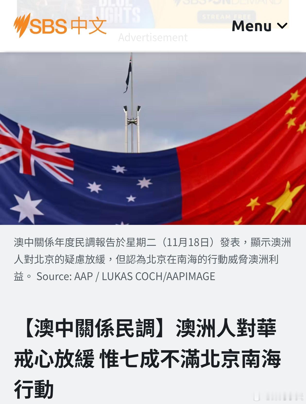 澳民调:反华比例由3/4下降到2/3悉尼科技大学澳中关系研究所的调查共2,045