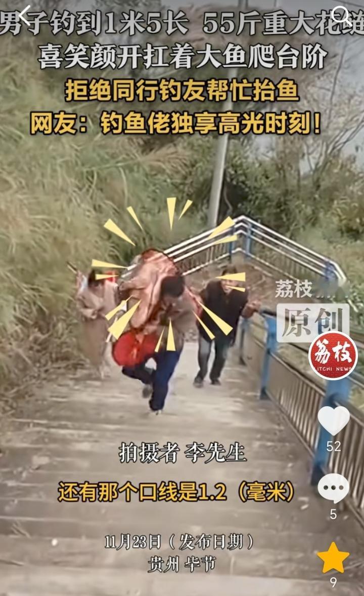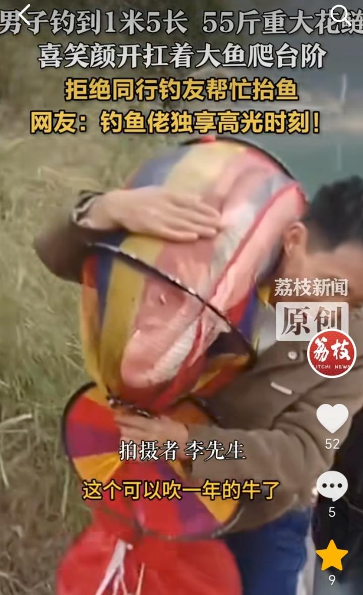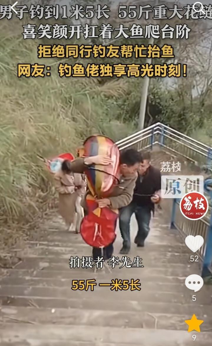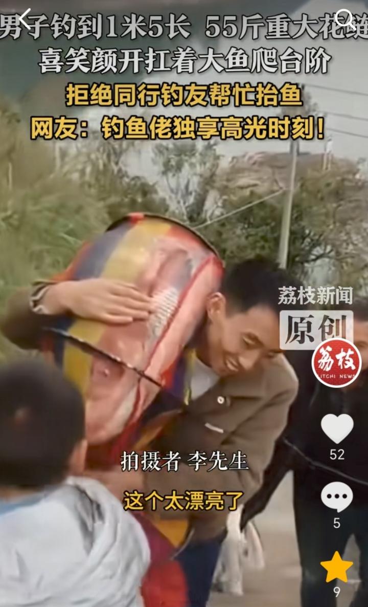 高光时刻!贵州毕节,男子用1.5毫米的主线,1.2毫米的口线钓到了一条1米5长,55斤重的大花鲢,他把鱼直接扛在肩膀上爬坡还不让钓友帮忙。拍摄者称,太漂亮了,这个可以吹一年的牛。 运气来了挡都挡不住,男子扛着鱼爬坡的那一刻是他的高光时刻,不让钓友帮忙,这是生怕别人不知道是他钓的,如果条件允许可能他直接扛到大街上炫耀一圈都行。 任何一位钓鱼爱好者看了估计都会羡慕,能钓到这么大一条鱼,不仅情绪价值拉满,而且还能吹几年的牛。 付出才会有收获,这也算是男子持之以恒钓鱼的回报。