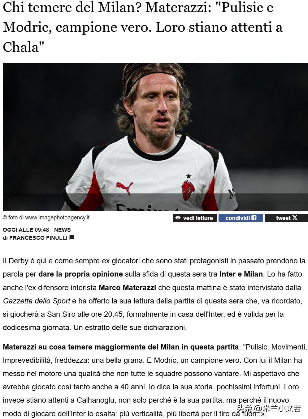 米兰德比之战,米兰层面最有威胁的球员是普利西奇与莫德里奇,他们是本场比赛的关键球员。国际米兰名宿马特拉齐接受采访表示本次德比之战国际米兰需要限制的球员除了普利西奇还有莫德里奇。 普利西奇一直以来都是米兰最有威胁的球员,因为他的动作不可预测,非常冷静。还有莫德里奇,他是真正的冠军,他为米兰注入了并非所有球队都拥有的那种自豪的品质。个人觉得莫德里奇现在很难直接威胁到对手球门了,米兰中场真正有威胁的球员是其他两人,拉比奥特如果状态恢复,他的带球推进和传球可以直接威胁国米,国际米兰现在后防线肋部空挡问题一直没解决,看看之前几场国际米兰的丢球,基本都是换位时候肋部空挡被抓住,米兰的问题在于谁能传球到那个位置,莱奥只需要接球突突突就行了。另外一个是福法纳,福法纳状态如果依然低迷,那对米兰而言他就是最大的威胁,他在中场被弱队都能一直找到空挡,碰到国际米兰就彻底被打爆了。 同时马特拉齐提到了恰绿,他说米兰也要小心国米的恰尔汗奥卢,因为在国米的新战术中,恰尔汗奥卢的位置前移了,有更多的直传和远射。个人觉得这恰恰是国际米兰现在的问题,恰绿位置前提后他的衔接功能被削弱了,所以中场和后场在才会有空档,齐沃也是没有办法,毕竟恰绿年龄大了,不可能在和原来一样,能兼顾防守与衔接,所以只能位置前提去发挥他的攻击,足球比赛就是抑制与反制,就看米兰能不能找到国际米兰漏洞了,或者说能不能利用漏洞,这个漏洞我一个球迷都看的到,阿莱格里不可能看不到,普利西奇与拉比奥特能不能利用国际米兰换位时候的空挡就是本次德比之战的结果。