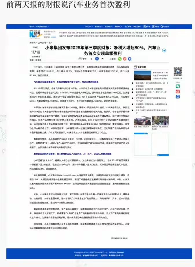 小米汽车每辆赚6.65万 这到底是“骗”了吗?还是另一场精心布局的战略大戏?雷军用一句“每辆亏6万”,让无数人心头一紧,仿佛在告诉我们:创业路上,没有轻松的成功,没有一帆风顺的奇迹。可是,短短一年后,小米汽车却实现了令人瞠目结舌的逆转,从亏损到盈利,仿佛换了个人似的。 很多人会问:这真的是“逆转”吗?还是雷军早就埋下了伏笔?答案或许在于,他用一句“亏6万”点出了行业的痛点——高投入、低回报的早期阶段。汽车行业的“烧钱”已成为常态,很多企业都在试图找到盈利的突破口。而小米的“规模经济”策略,就是在这个过程中逐渐显现威力。 你会发现,这个故事的背后,藏着人性最真实的一面:坚持与耐心。雷军没有盲目追求短期利润,而是坚持“用户为中心”,不断优化产品、降低成本、扩大规模。正是这种“缓慢而坚定”的积累,让小米汽车逐步走出了亏损泥潭,迎来了盈利的曙光。 更深层次地看,这也反映出一个行业的“本质”:创新不一定意味着一夜暴富,而是通过不断的调整、优化,最终找到那条属于自己的盈利路径。就像雷军在手机行业的崛起一样,靠的不是一蹴而就的奇迹,而是对市场的深刻洞察和持之以恒的努力。 这场逆转,也让我们重新审视“失败”的定义。也许,所谓的“亏损”只是一个阶段的必经之路。只要方向正确,策略得当,逆境中孕育的机遇就会逐渐浮现。雷军用实际行动告诉我们:不怕“亏”,只怕“没有坚持下去的勇气”。 你是不是也曾在创业、工作或生活中遇到过“亏损”的时刻?是否也曾质疑自己的选择?其实,只要你相信“坚持就是胜利”,或许下一秒,就是你人生的“盈利时刻”。欢迎留言,分享你的故事,也让我们一起为那些在逆境中坚持的人喝彩!小米汽车 雷军小米车