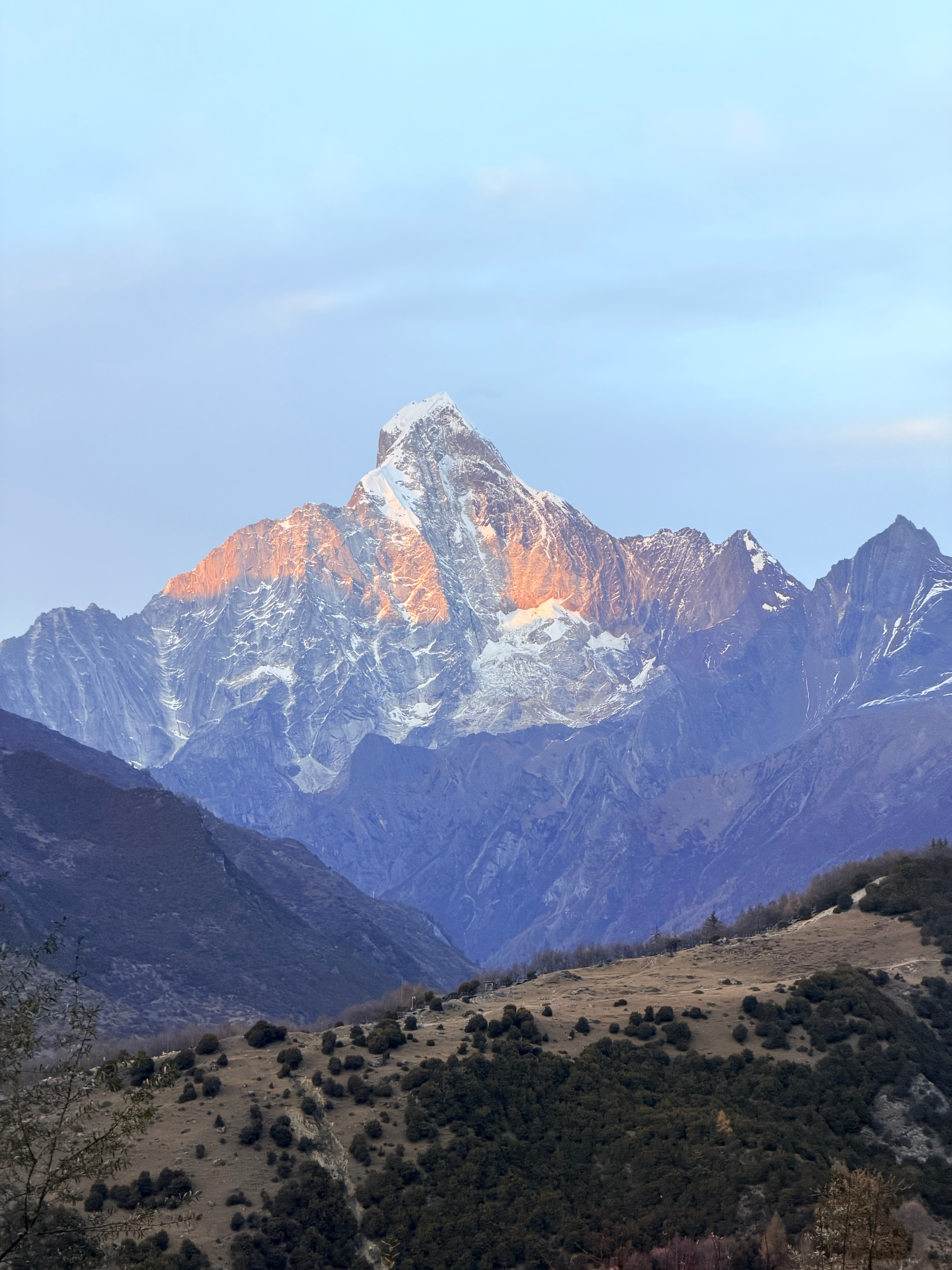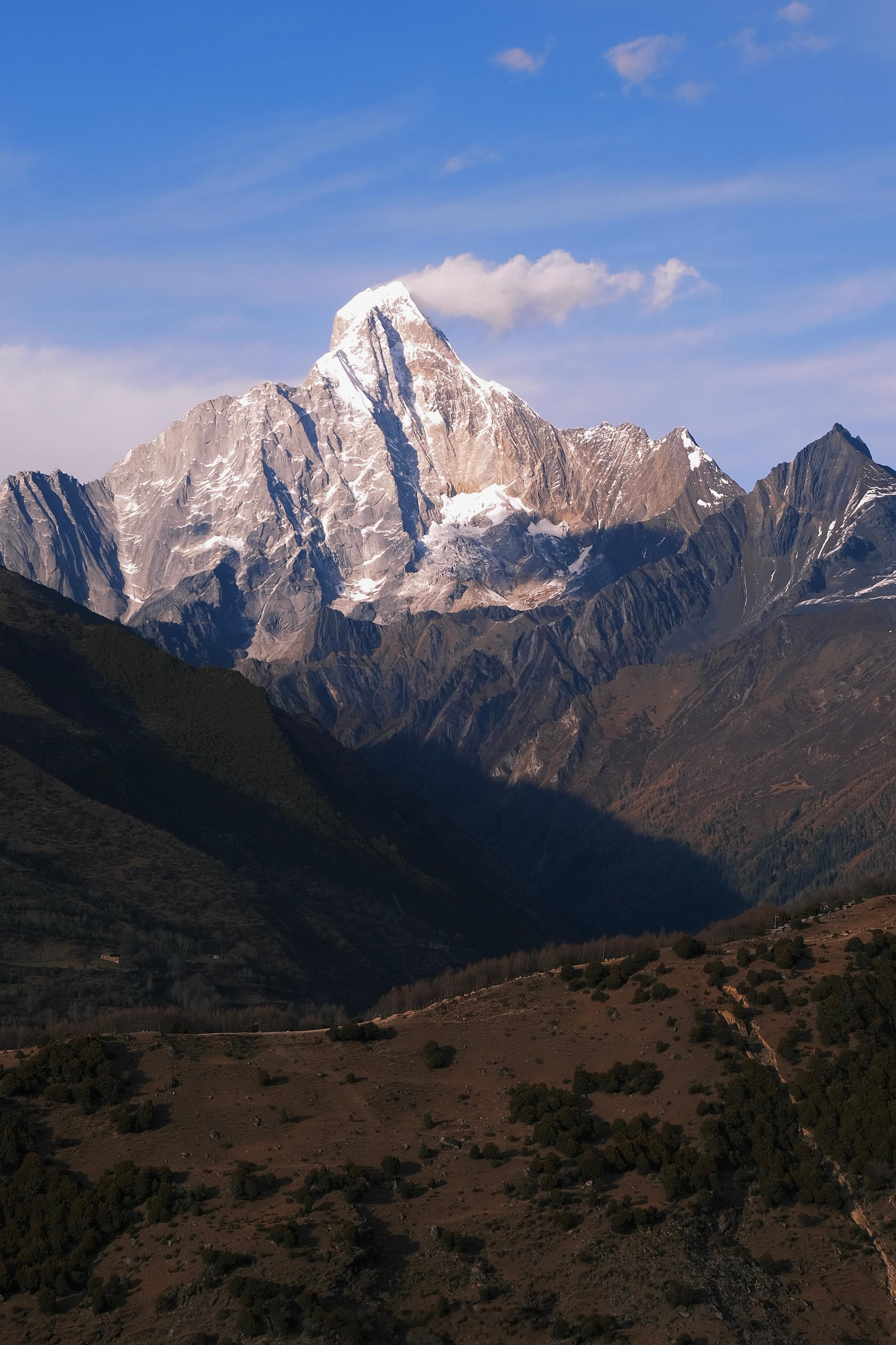 运气好的人才能看到四姑娘山的全貌。从左到右,幺妹儿峰,三峰,二峰,大峰。