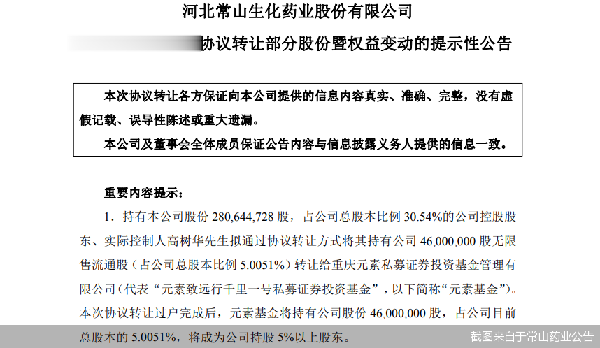 常山药业最新公告显示,高树华拟通过协议转让方式将其持有的公司4600万股无限售流通股(占公司总股本比例5.0051%)转让给重庆元素私募证券投资基金管理有限公司(代表“元素致远行千里一号私募证券投资基金”,以下简称“元素基金”)本次协议转让过户完成后,元素基金将持有公司股份4600万股,占公司目前总股本的5.0051%,将成为公司持股5%以上股东。高树华及其一致行动人合计持股比例将下降至25.7%。