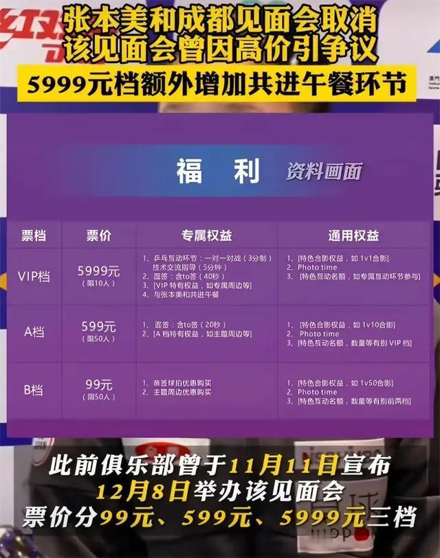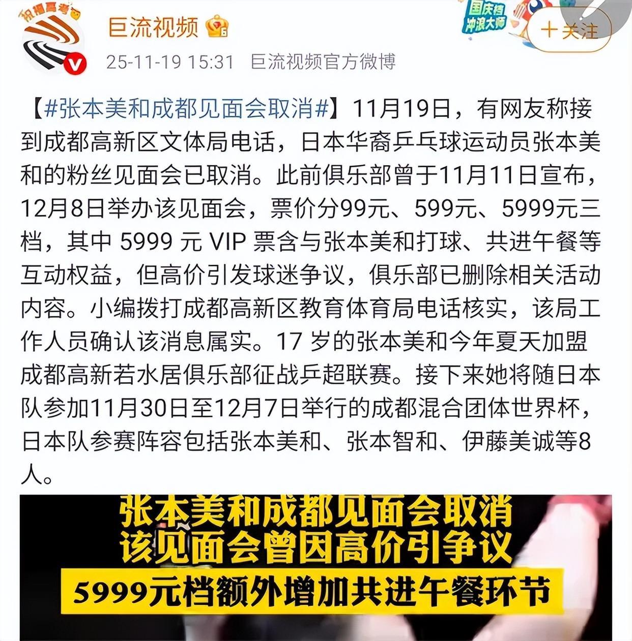 正式取消,张本美和错失中国捞金机会,原因曝光,张本宇无奈!近日,成都文旅局宣布,成都若水居俱乐部原定于12月8日举办的日乒名将张本美和球星见面会将正式取消,目前成都若水居俱乐部已删除相关宣传内容,由于事发突然,引发球迷强烈关注。据悉,此次见面会是17岁华裔日籍选手张本美和首次尝试在中国收费与球迷互动,活动的突然取消,打了张本美和一个措手不及。张本美和见面会取消据了解,张本美和凭借近年来的亮眼表现积累了不少中国粉丝,若水居俱乐部此前曾为其举办过免费见面会,此次商业化尝试原本被寄予厚望,活动最初官宣时设置了99元、599元及5999元三档票价,其中5999元的VIP套餐包含与张本美和切磋3次击球、5分钟技术交流、共进午餐及1V1合影等权益,高票价引发部分球迷吐槽 “性价比不足”“借球星人气割韭菜”的不满声音。球星见面会正式取消,张本美和错失在中国捞金机会,原因得以曝光,相较于票价太高引发的争议,更值得关注的是此次活动取消背后的深层原因,近期因日方领导人的不友好言论,成为影响此次中日民间交流活动推进的关键因素。巧合的是,同期日本男团JO1的广州见面会也以 “不可抗力” 为由宣布取消,更加说明作为领导人,谨言慎行有多么重要,当整体交流环境趋于敏感时,国人对跨国商业活动的关注度和情绪反应会更为强烈,主办方在此时推进相关活动,难免要面临更大的舆论压力与风险,因此成都文旅局将见面会活动取消才是最好的决定,对此,张本美和的父亲张本宇也表示相当无奈。对于张本美和来说,此次见面会取消是一次不小的挫折,中国市场本是其拓展商业版图、提升国际影响力的重要阵地,却由于日方领导人的错误表态,让她错失了首次在中国实现商业变现的机会。成都若水居俱乐部此次商业化尝试原本被视为弥补赛季战绩不佳、提升品牌关注度的重要举措,因对市场环境的判断不足未能成行。目前,俱乐部正在处理票务退款、场地租赁协调、合作方沟通等一系列后续事宜,跨国体育商业活动的策划与执行,不仅要考虑球星人气、粉丝需求、商业回报等因素,更需要精准把握当下的社会情绪与环境氛围,尤其是在敏感时期,更应考虑到大众感受,避免因决策失误引发争议,在中国的坚定立场下,成都若水居这些损失都可以忽略不计。体育的本质是连接与包容,相信未来随着日方改变错误立场,两国运动员与球迷之间的互动将重回正轨,张本美和未来若能继续专注赛场、用实力说话,凭借体育精神赢得更多中国球迷的认可,仍有机会在中国市场实现商业价值与个人影响力的双重提升,当然,如果日方坚决不改变错误立场,那么张本美和将永远别想在中国办什么球星见面会。