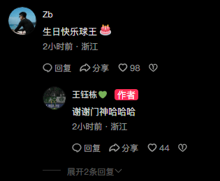 中国国家队官方亦送上祝福:“岁月从不辜负努力之人,愿你一路怀揣梦想披荆斩棘,坚定前行乘风飞翔,在人生的下一站,成为更好的自己。祝王钰栋生日快乐!”