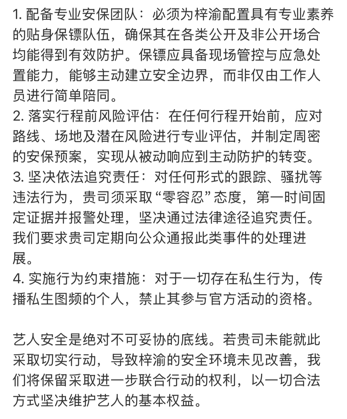 梓渝官方粉丝团发文向瑞鹤娱乐提出4点诉求。主要是要求配备安保和抵制ss瑞鹤真的应该上点儿心保护好你自家的财神爷这么个小公司搞到顶流半夜都应该笑醒了吧