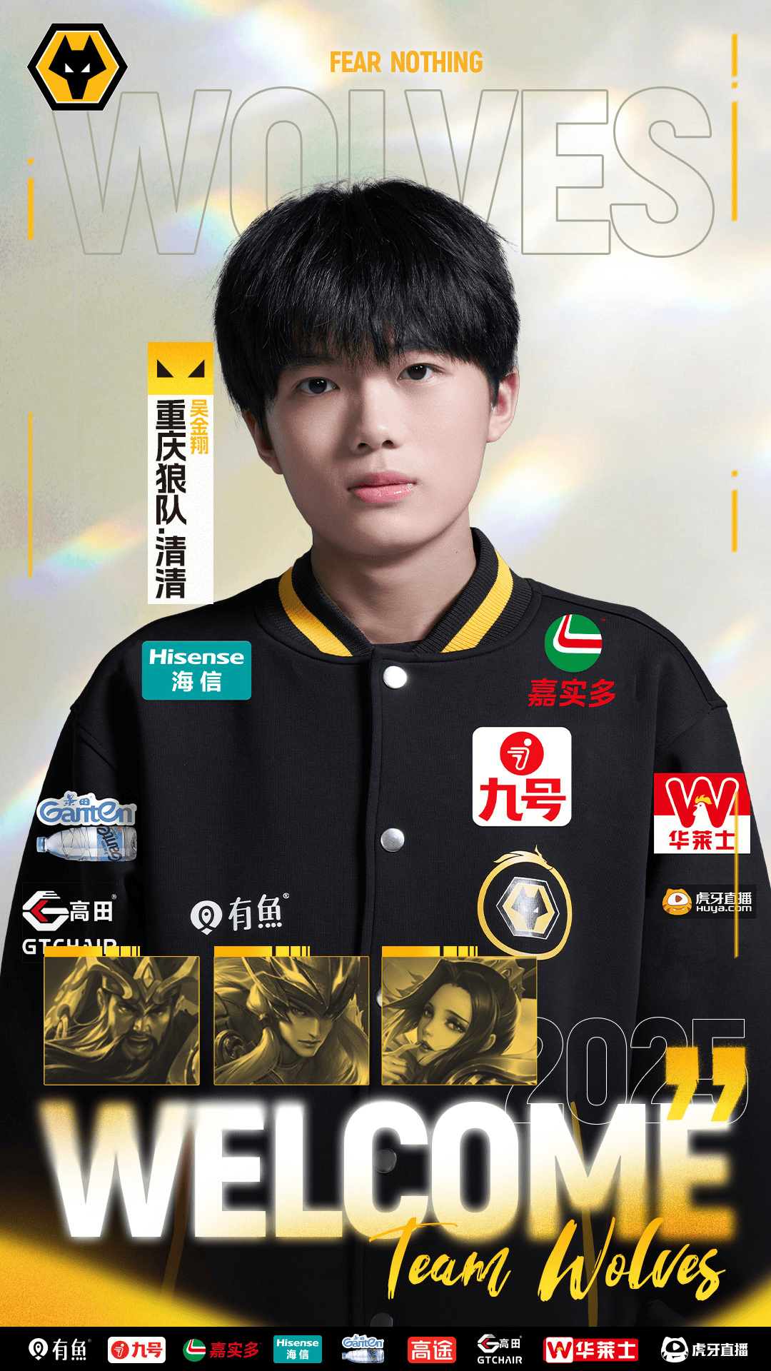 即日起,原广州TTG对抗路选手清清(吴金翔)现正式加入重庆狼队,今后将随队征战接下来的职业赛事。
