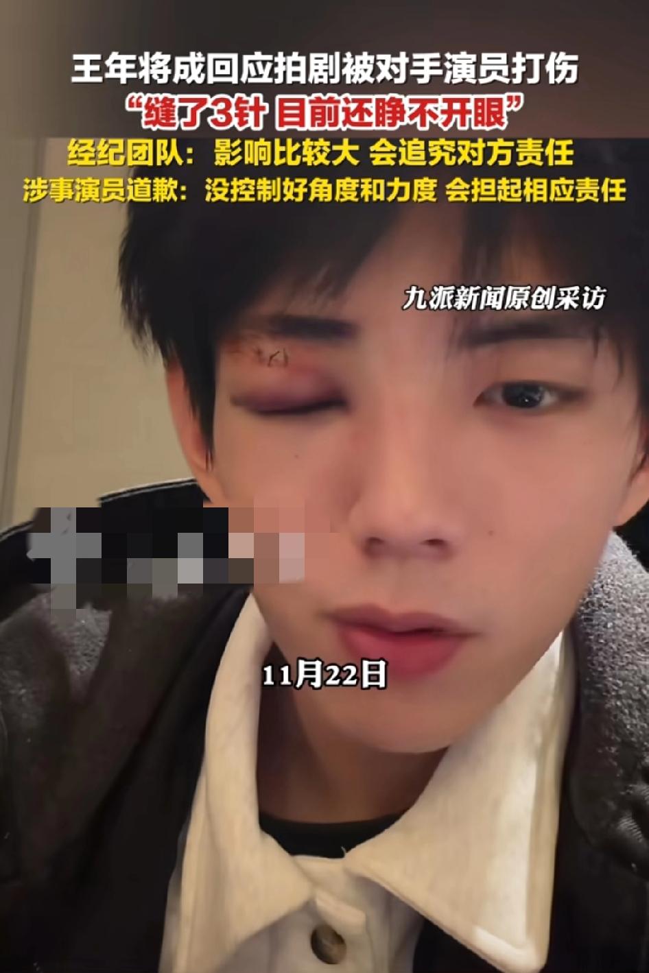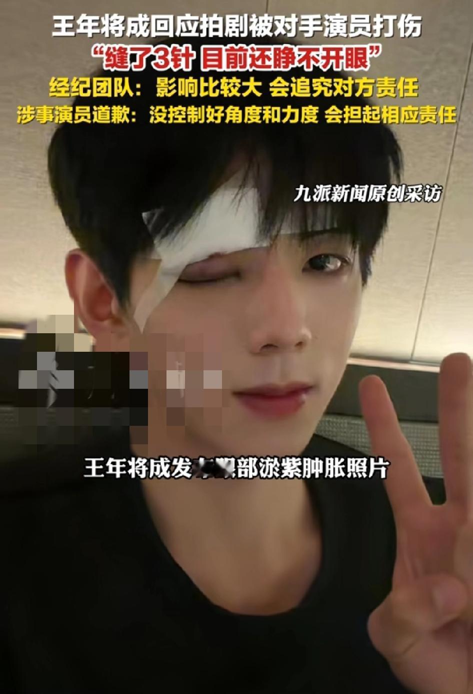 王年将成回应拍剧被对手演员打伤 “缝了3针 目前还睁不开眼”,影响比较大,会追究对方责任 涉事演员道歉:没控制好角度和力度,会担起相应责任。还借位拍摄位置不对,人家台词都没说呢。而且这个吕奕豪在打到他以后,这个动作非常的漫不经心,如果是不故意打到的话,一定会双手抱住他,并观察情况而吕奕豪就是一只手去捞住王年将成感觉就是报私仇 最近刚看了王年将成拍的短剧,拍的还挺高,大高个,刚看完觉得演员很不错,这就被打伤了。