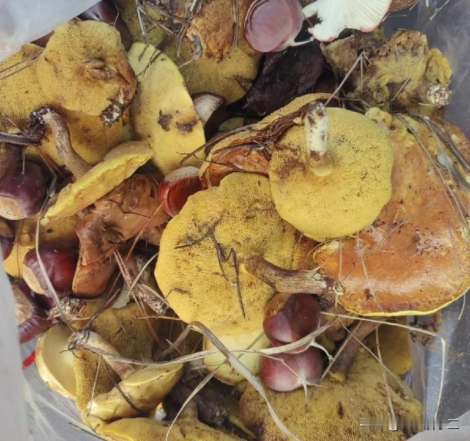 分享我这周有趣的事: 昨天和小伙伴上山玩,看到山上好多的蘑菇,便采了一箩筐。 可就在采蘑菇的时候,发现了两颗类似灵芝的东西,因为不太熟悉不知道能不能吃,再加上还很小,直到现在也没敢吃,有没有小伙伴知道这是什么?
