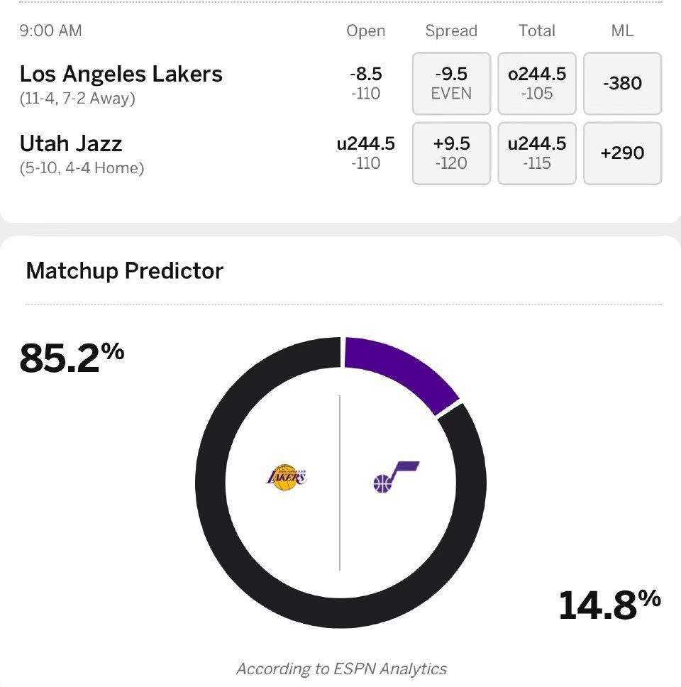 明天湖人终于有比赛了!客场再战爵士,ESPN预测湖人胜率高达85.2%!