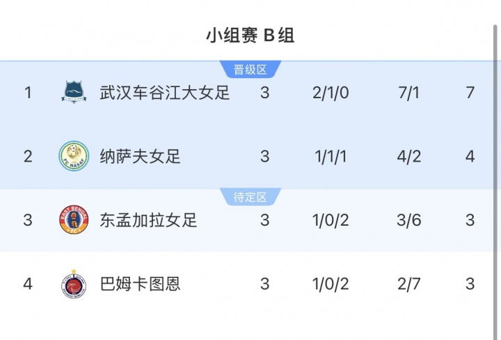 晋级8强!女足亚冠B组积分榜:武汉女足2胜1平积7分第1!
