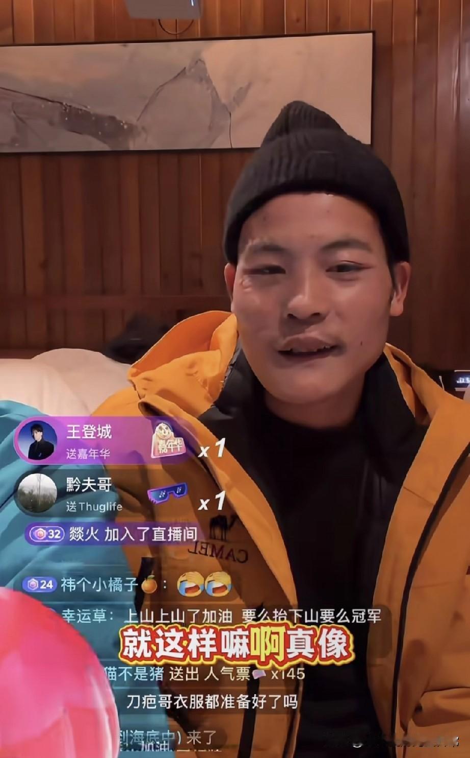 这荒野刀疤哥是直播流量王礼物不断! 刚蹲完他一小时直播:屏幕里“嘉年华”特效炸得晃眼,跑车、人气票跟不要钱似的往出蹦,评论区“上山夺冠”的刷屏都压不住礼物弹窗。这大哥裹着黄外套、戴个黑帽,话没说三句,礼物音效就没停过——粉丝喊他“野王”,刷礼物的手比喊口号还快。 有人算:这一小时的礼物,顶普通人干小半年。评论区吵翻了:有人说“这才是野生网红的排面”,有人酸“都是剧本刷的吧”。但你看满屏的“真像”刷屏,是观众傻还是这热度真能接住? 现在这直播圈,到底是“会唠”重要,还是“真有活”更长久?