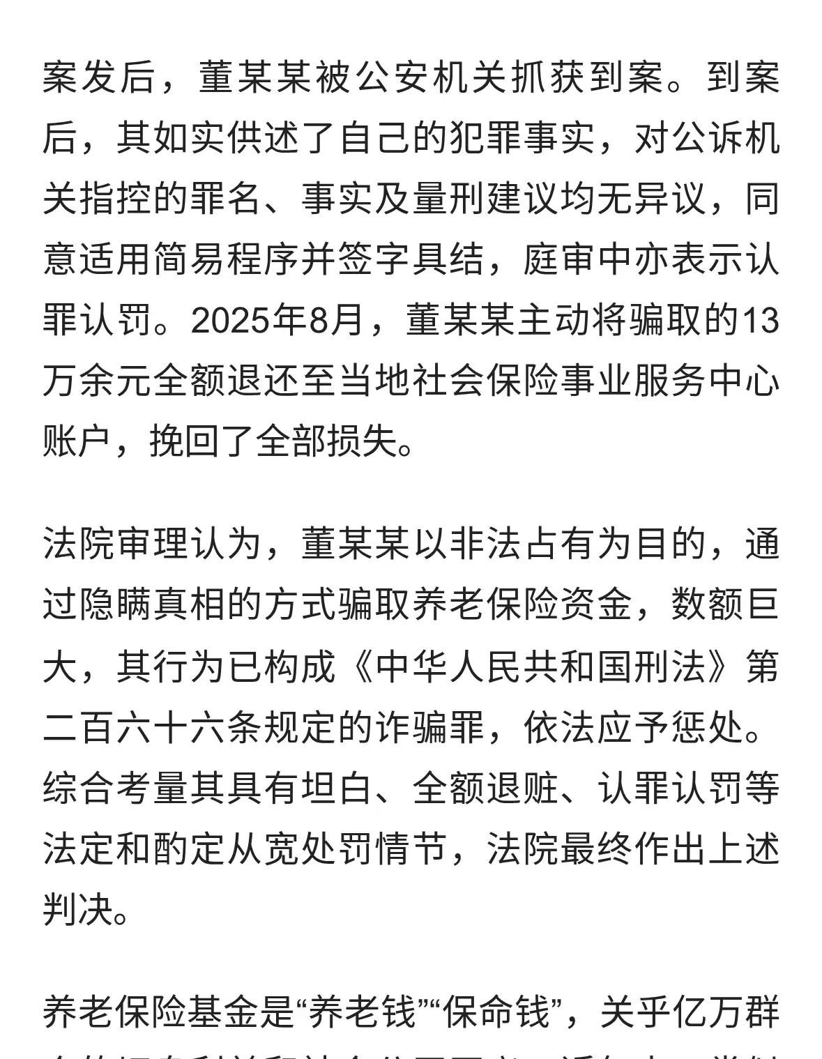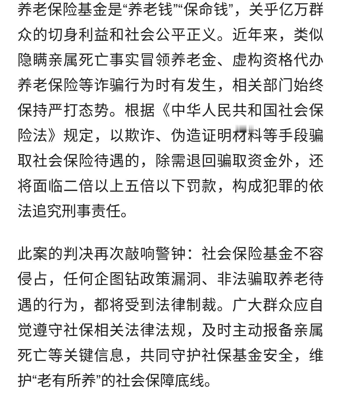 女子隐瞒丈夫去世支取其养老金获 关于“女子隐瞒丈夫去世支取其养老金获刑”的事件,以下是详细的背景和分析: 事件概述 事件内容:一名内蒙古女子隐瞒其丈夫去世的事实,冒领了丈夫的养老金,共计13万元人民币。 法律后果:因涉嫌诈骗罪,该女子被依法判处有期徒刑。 事件细节 隐瞒事实:女子未如实报告丈夫去世的情况,继续领取养老金,属于非法占有国家财产的行为。 诈骗行为:通过隐瞒事实,非法获得养老金,构成诈骗罪,违反了相关法律法规。 法律分析 诈骗罪定义:以非法占有为目的,采用虚构事实或隐瞒真相的方法,骗取财物,数额较大即构成诈骗罪。 法律责任:依法应承担刑事责任,判处有期徒刑,并追缴非法所得。 事件意义 加强社会监管:此事件提醒公众要依法诚信,不能以非法手段获取财产。 完善制度:养老金管理部门应加强对领取人员的身份核查,避免类似事件发生。 法律威慑:依法惩治诈骗行为,维护社会公平正义。 结语 此案体现了法律对非法占有公共财产行为的零容忍态度,也提醒公众遵守法律法规,诚信守法。如有亲属去世,应及时报告相关部门,避免违法行为。