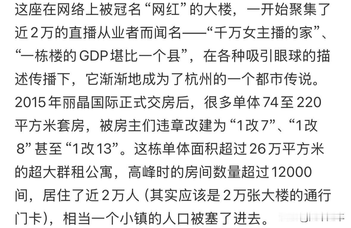 难道是网红流量时代结束了? 根据网络信息显示,25年杭州网红大楼丽晶国际租金腰斩、主播批量撤离的冷清景象,这所曾容纳近2万名主播单间月租金,从峰值4500元暴跌至1200-1800元降幅超60%,楼外中介密集挂出“急租降价”广告。楼内网红身影被普通上班族和中老年居民取代,美甲、摄影工作室等填补空间,整栋楼入住率大幅下降。而且头部MCN机构如辛选撤回广州,向太撤离杭州滨江智慧之门办公室,疯狂小杨哥团队转移至运营成本更低的成都、武汉、长沙等城市。 撤离或许是MCN运营成本过高了核心区房租+人工成本高,中小网红收支倒挂。资本退潮融资锐减,中小MCN无资金支撑被淘汰。商家付费弱主播流量转率化下滑,品牌投报比低,砍坑位费+佣金,中小主播收入腰斩难维生。以及行业偷税漏税问题遭严查,刷单、投流成本叠加缴税压缩了利润空间,让刚入行的从业人员离场。 在短视频刚火的时候,杭州网红产业富得流油,资本、机构、消费者都在往里面疯狂砸钱。之后短视频平台又迎来了直播带货的狂潮,杭州受益于长三角成熟的供应链,再次登上风口浪潮。之后随着直播带货的被投诉率高增长国家决心介入监管,开始清退劣质内容和直播机构,驱动行业回归正轨。24年开始杭州头部主播的收入极大缩水,中腰部主播平均月薪同比下降30%遍地捞金的好日子就此结束了。网红们开始计算房租和生活成本,不再为虚无缥缈的梦而挣扎。 由于网红经济的门槛太低,使得大量缺乏专业素养和职业道德的人进入该行业,导致劣质 网红层出不穷。一些网红为了吸引流量,不惜采用低俗、博眼球的手段,发布低俗内容、进行夸张表演。带货领域造假严重,很多网红缺乏基本的选品能力和质量把控意识,虚假宣传、卖假货成了家常便饭。加上他们商业信誉观念淡薄,唯利益论、唯流量论。所以整个行业从“流量为王”转向“供应链为王”,MCN机构向货源地迁移,所以才有了今年杭州网红集体消失的现象。 杭州网红经济退潮并非电商产业衰落,而是挤出了不良品后的价值回归。从开始追逐、烧钱、造神到深耕品牌、质量、造货,从博快钱转向可持续经营。