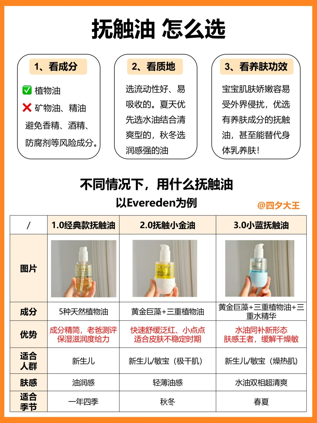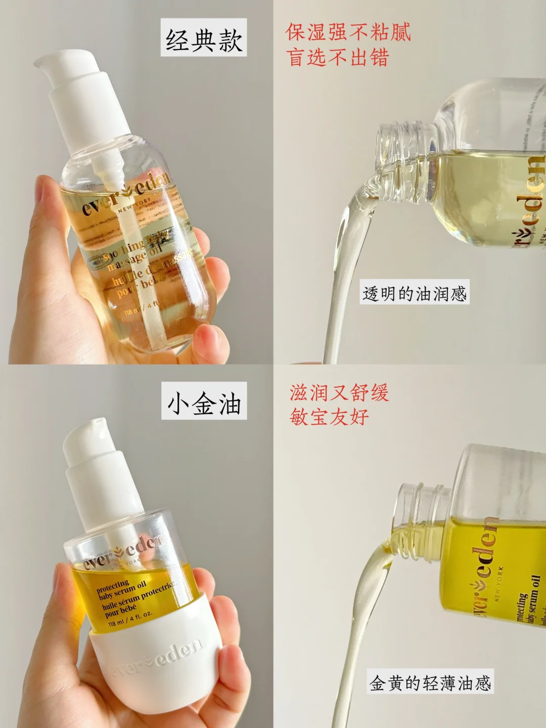 🔹而且根据不同肤质肤感细分成3款抚触油!我们家用的勤,基本一个月1瓶[笑哭R],刚好Evereden的3款我都用过,给你们捋一捋: