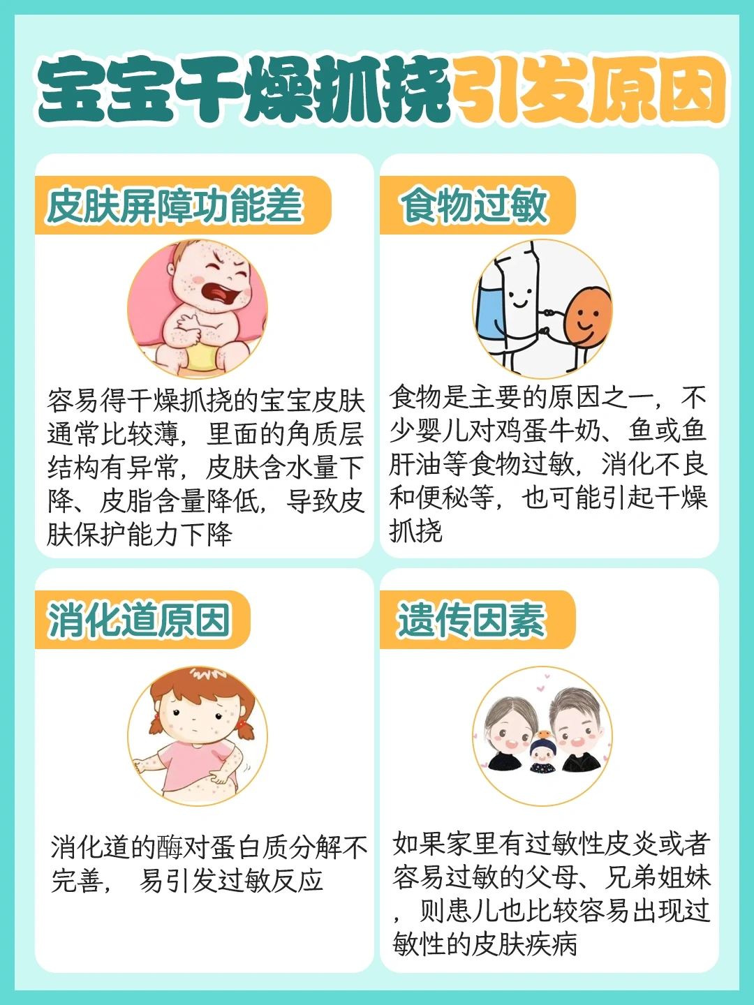 食物是主要的原因之一,不少婴儿对🥚牛奶、鱼或鱼肝油等食物过敏,消🌹不良和💩秘等,也可能引起干燥挠痒