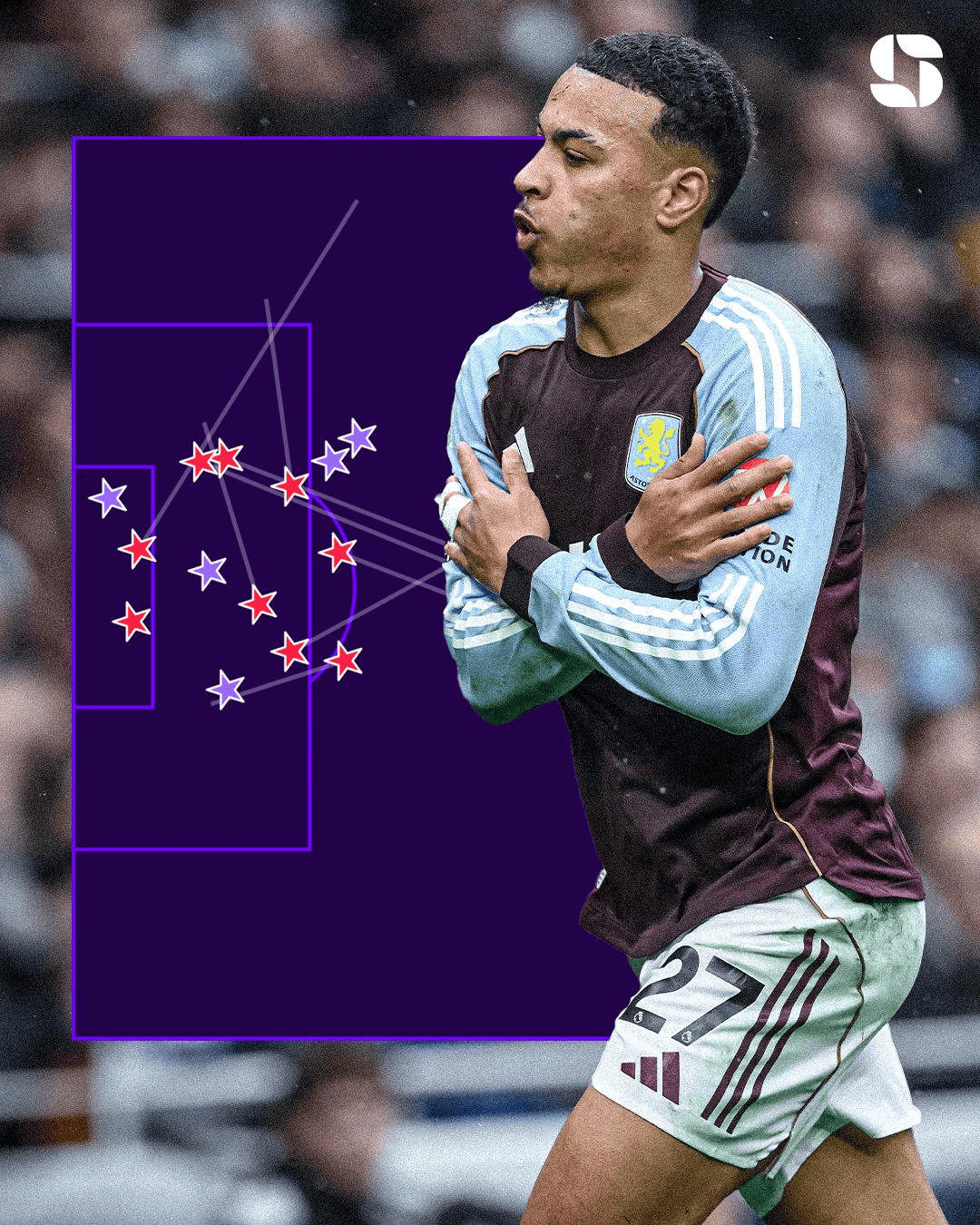 他是2025自然年里参与英超进球最多的阿斯顿维拉球员——他目前已经贡献了5球9助攻。