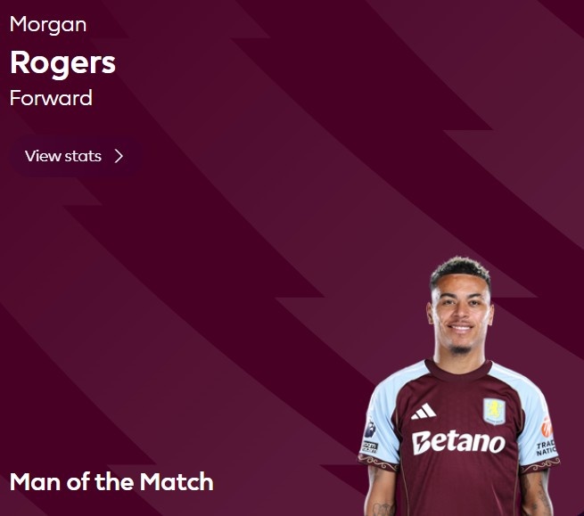 直播吧11月24日讯英超第12轮,阿斯顿维拉客场2-1击败利兹联。据赛后英超官方消息,摩根·罗杰斯当选此役最佳球员。