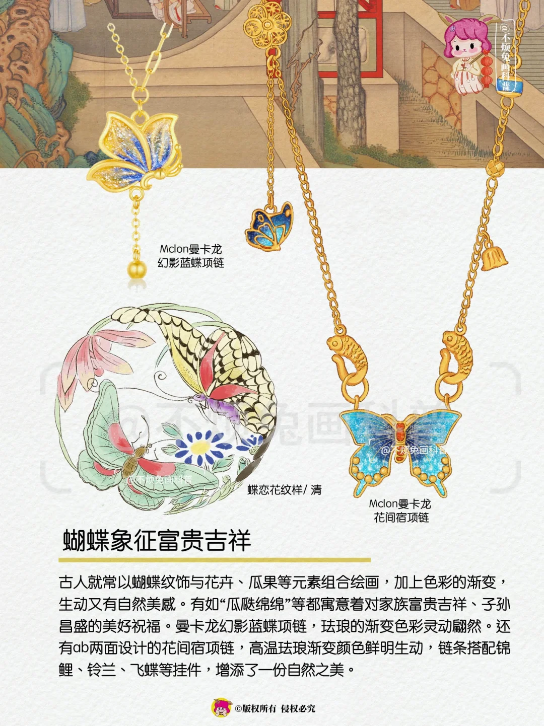 古人就常以蝴蝶纹饰与花卉、瓜果等元素组合绘画,加上色彩的渐变,生动又有自然美感。有如“瓜瓞绵绵”等都寓意着对家族富贵吉祥、子孙昌盛的美好祝福。曼卡龙幻影蓝蝶项链,珐琅的渐变色彩灵动翩然。还有ab两面设计的花间宿项链,高温珐琅渐变颜色鲜明生动,链条搭配锦鲤、铃兰、飞蝶等挂件,增添了一份自然之美。