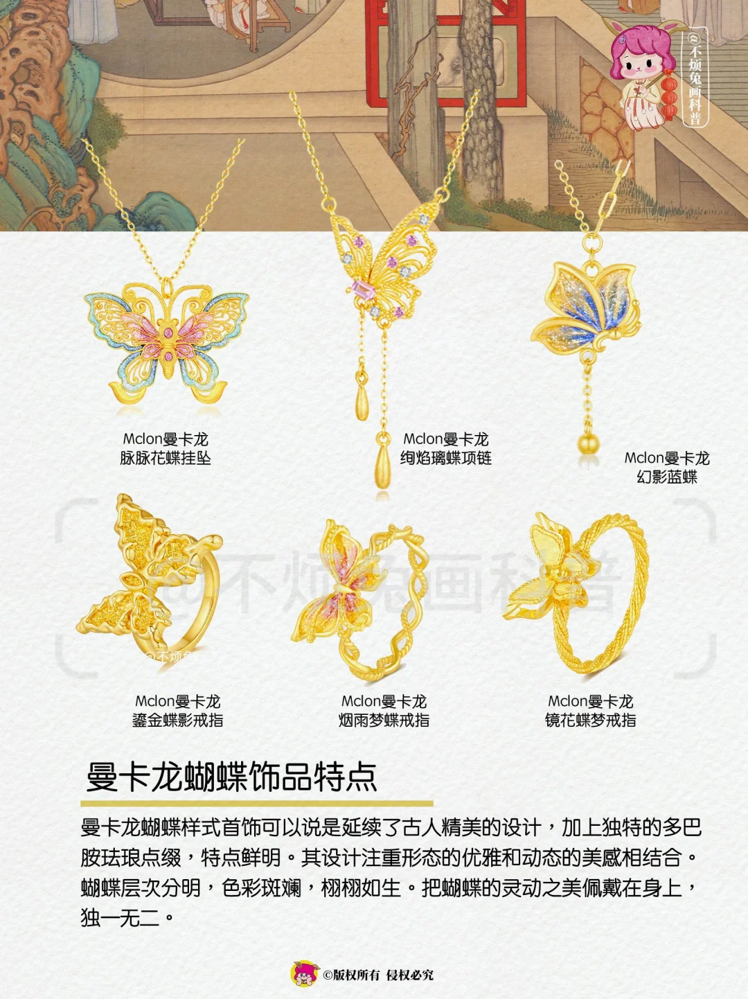 花蝶形象千姿百态,有平面到立体的设计,视觉效果更生动有趣,搭配丰富色彩,有红、蓝、紫、金等多种配色,清新又可爱,充分显示了古代匠师们高超的工艺技巧,以及古人对艺术形态的追求。有如曼卡龙鎏金蝶影戒指,不规则的蝴蝶造型多了份趣味;绚焰璃蝶项链立体视觉感更生动,加上宝石点缀,明亮又美丽。