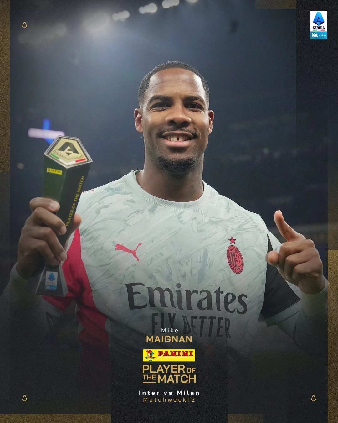 虎扑11月23日讯意甲第12轮,AC米兰客场1-0战胜国际米兰,迈尼昂扑出由恰尔汗奥卢主罚的点球,赛后意甲官方宣布迈尼昂当选本场比赛最佳球员。