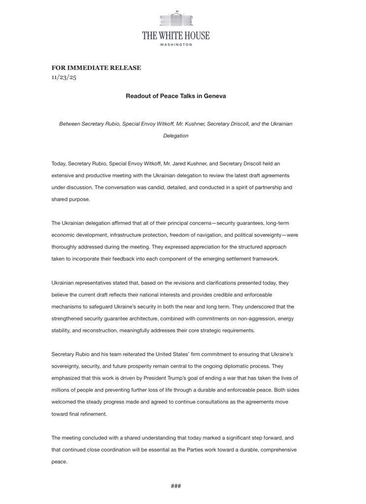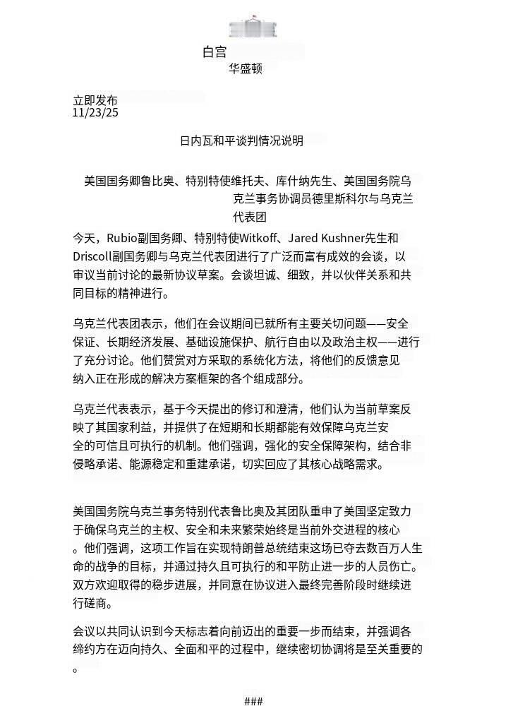 新闻快讯:白宫就美国与乌克兰在瑞士日内瓦举行的和平谈判发布简报。 “乌克兰代表团证实,其所有核心关切——安全保障、长期经济发展、基础设施保护、航行自由及政治主权——均在会议期间得到全面讨论。” “乌克兰代表表示,基于今日达成的修订内容与澄清说明,他们认为当前草案既体现了本国利益,也提供了可信且可执行的机制,以保障乌克兰近期及长期安全。”