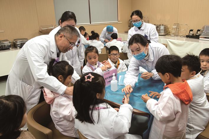 昨天,嘉兴市实验小学东校区101班的学生们走进嘉兴邦尔骨科医院,他们身着定制白大褂、佩戴专属胸牌,在医护人员的带领下开启了“从医初体验”。