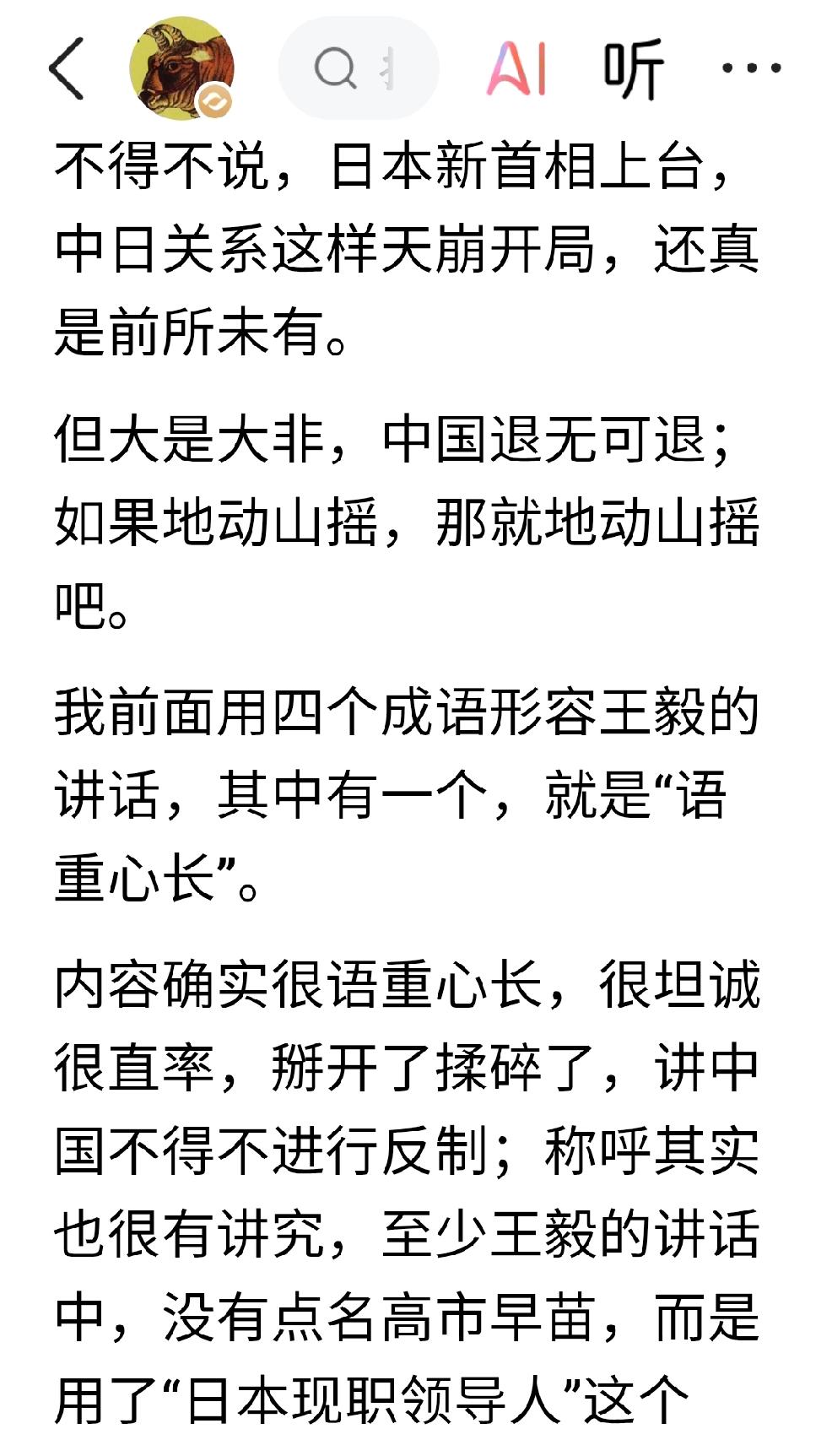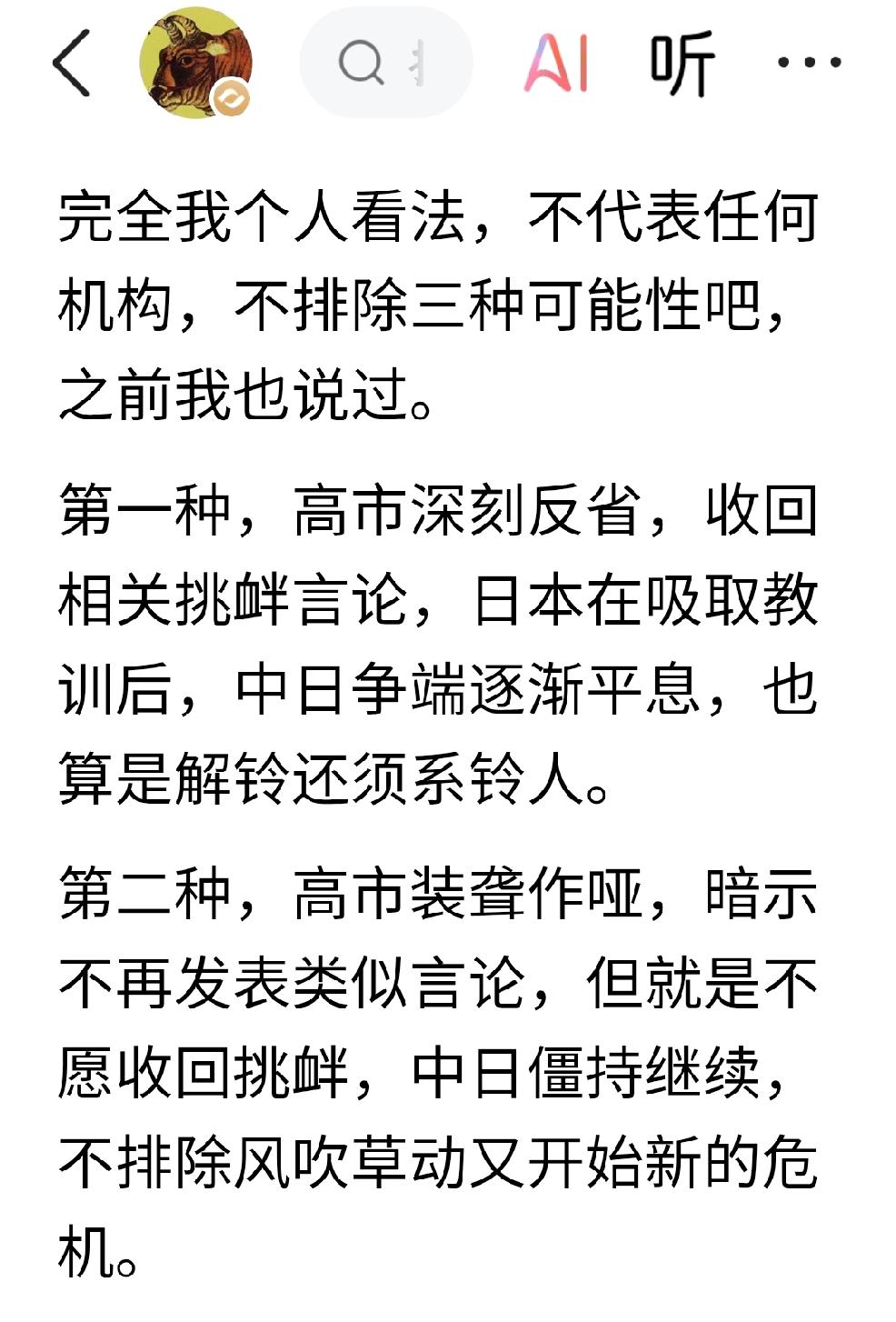 当下的钟声就是昔日的冲锋号 个人观点•大概率预判: 个人认为,当下的钟声就是昔日的冲锋号,开弓没有回头箭,继续反制,但是需要迭代反制。 要想反制持续有效,就要更新反制,迭代反制。 日本这个国家已经变质了,从来都是披着人皮的狼,只是伪装成人的模样,混迹在人类的社会。