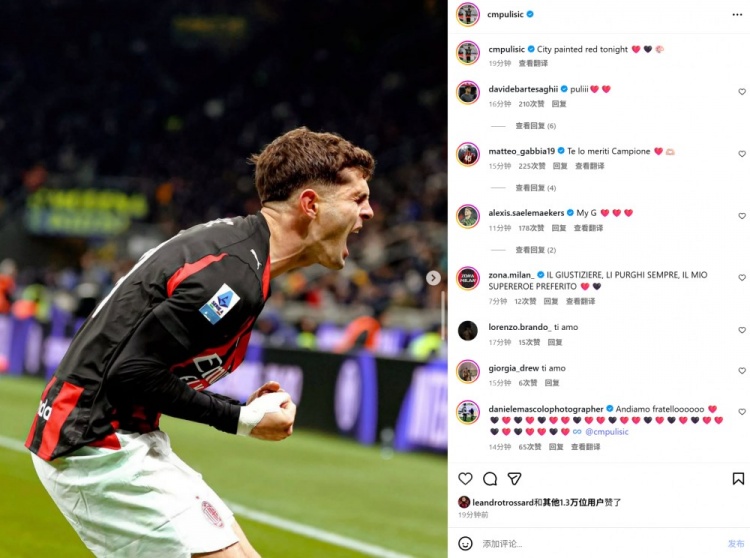 本场比赛普利西奇打进全场唯一进球,赛后他也在社媒晒出庆祝照片,配文写道:“今晚米兰城涂上一抹红色!”