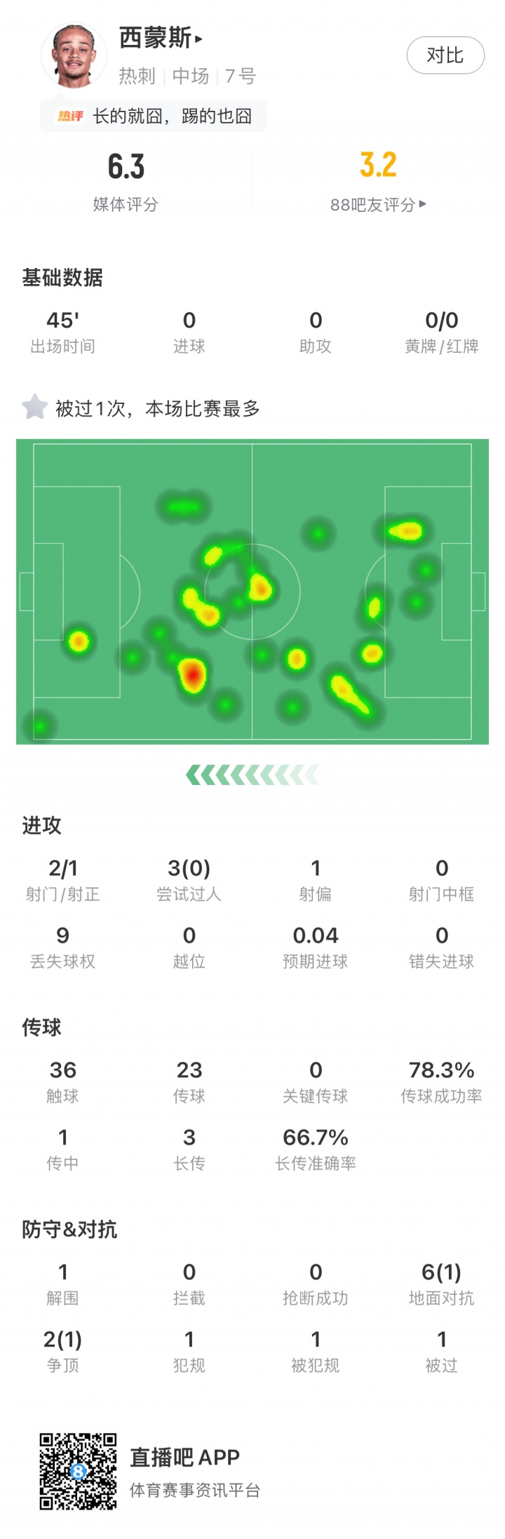 西蒙斯此役下半场替补登场,2次射门1次打正,3次尝试过人0成功,0关键传球,6次地面对抗1成功。