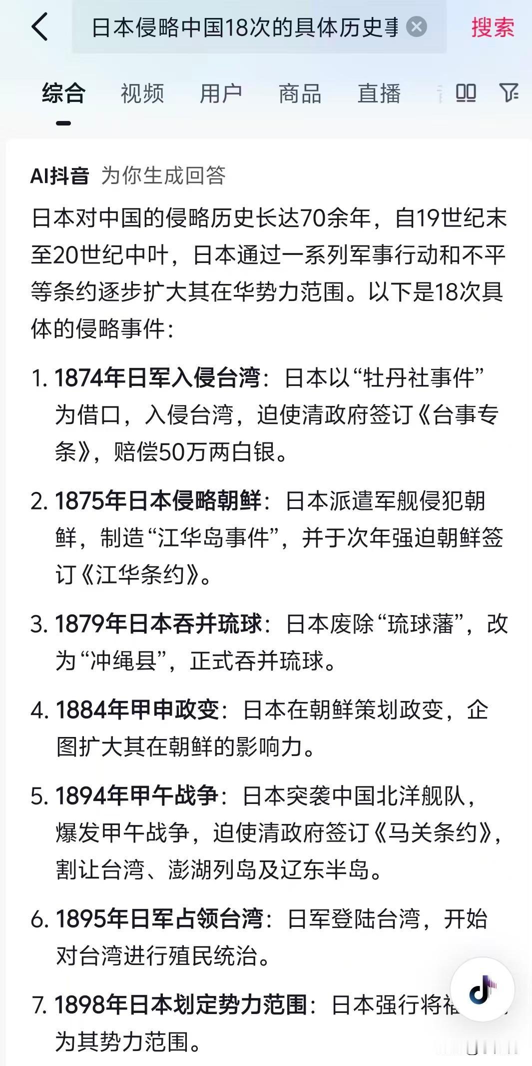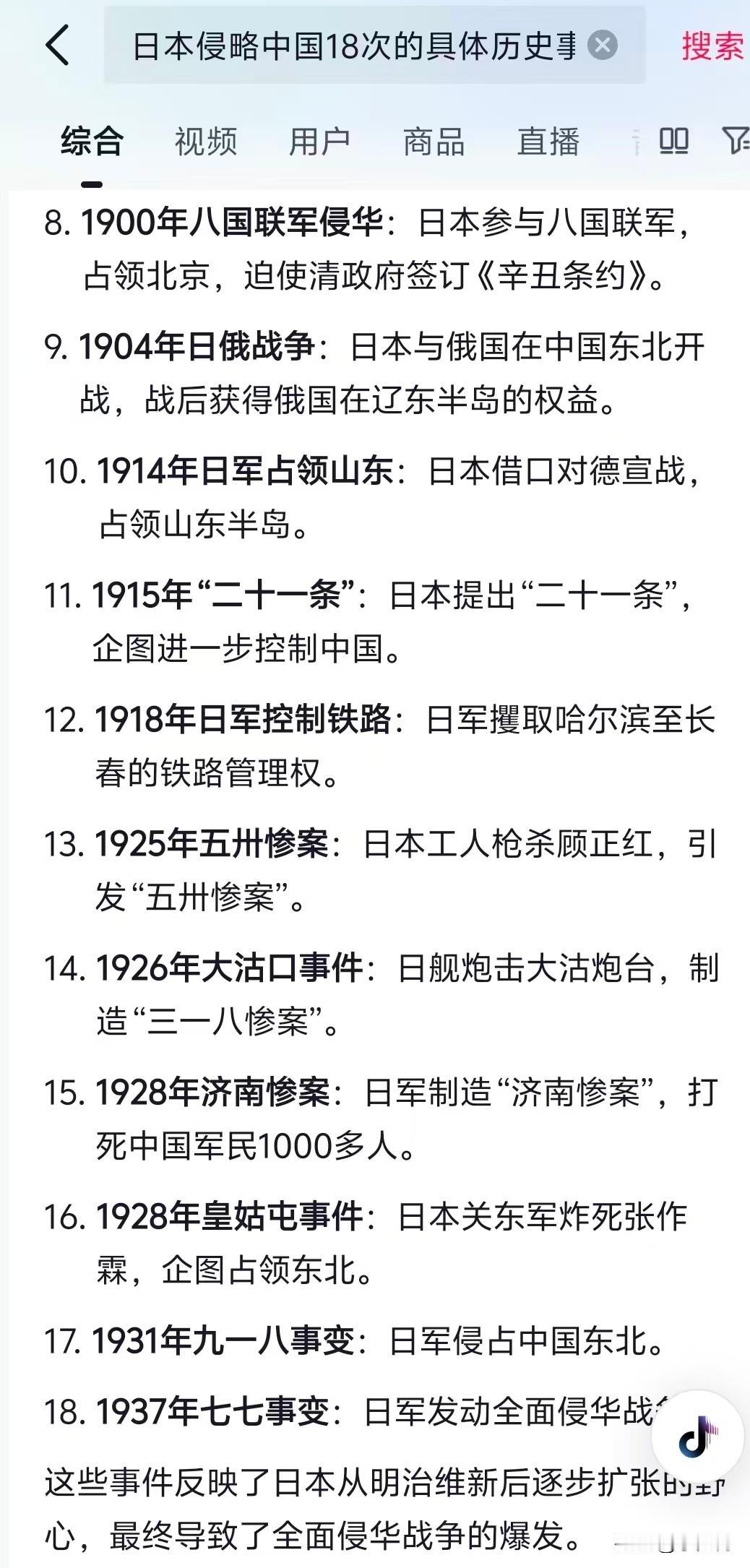日本侵略中国18次,以及后面的南京大屠杀等……日本凭什么要求中国人“大度”,真相就是真相,不容让时光掩盖罪恶。 1. 白村江海战 (公元663年) 日本主动挑衅,与唐朝、新罗联军在朝鲜半岛白村江决战,最终惨败。此役奠定了东亚此后近千年的政治格局。 ​ 2. 倭寇侵扰 (16世纪中后期) 日本海盗频繁骚扰明朝东南沿海,史称“倭寇之患”,对中国沿海经济和人民生活造成了严重破坏。 ​ 3. 万历朝鲜战争 (1592-1597年) 丰臣秀吉统一日本后,两次大规模入侵朝鲜,意图以朝鲜为跳板进攻中国。明朝出兵援助朝鲜,最终击退日军。 4. 入侵台湾与吞并琉球 (1874年) 日本借口“牡丹社事件”出兵中国台湾,并逐步吞并中国附属国琉球,将其改为“冲绳县”。 ​ 5. 中日甲午战争 (1894-1895年) 日本蓄意挑起战争,清朝战败后被迫签订《马关条约》,割让台湾、澎湖列岛,并赔偿巨额白银。 ​ 6. 强租旅顺口、大连湾 (19世纪末) 日本通过《中俄密约》等一系列不平等条约,强租中国辽东半岛的旅顺口和大连湾,作为其在远东的战略基地。 ​ 7. 八国联军侵华 (1900年) 日本派兵参加八国联军,是联军中出兵最多的国家。战后,中国被迫签订《辛丑条约》,日本获得在天津、北京等地的驻兵权,并拒绝归还庚子赔款。 ​ 8. 日俄战争 (1904-1905年) 日俄两国为争夺在东北亚的霸权,在中国东北土地上爆发战争,严重侵犯了中国的主权和领土完整。 终于在1945年8月15日,日本宣布无条件投降,从此中国人民站起来了,这一天值得每个中国人永远铭记。 日本历史罪责