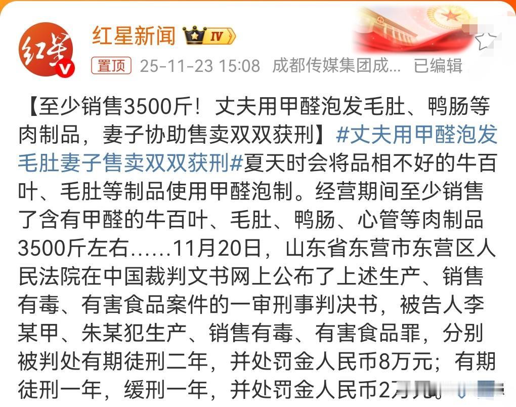 这真的是太丧心病狂了,这还是人吗?竟然干出这样的事情。 近日公布一起案例,一名男子竟然用甲醛泡发毛肚、鸭肠等肉制品。 至少销售了3500斤左右,妻子进行协助售卖。 男子被判有期徒刑两年,并处罚金8万,女子被判有期徒刑一年,缓刑一年。处罚金2万。 用甲醛泡牛肚等肉制品,这真的是太害人了。
