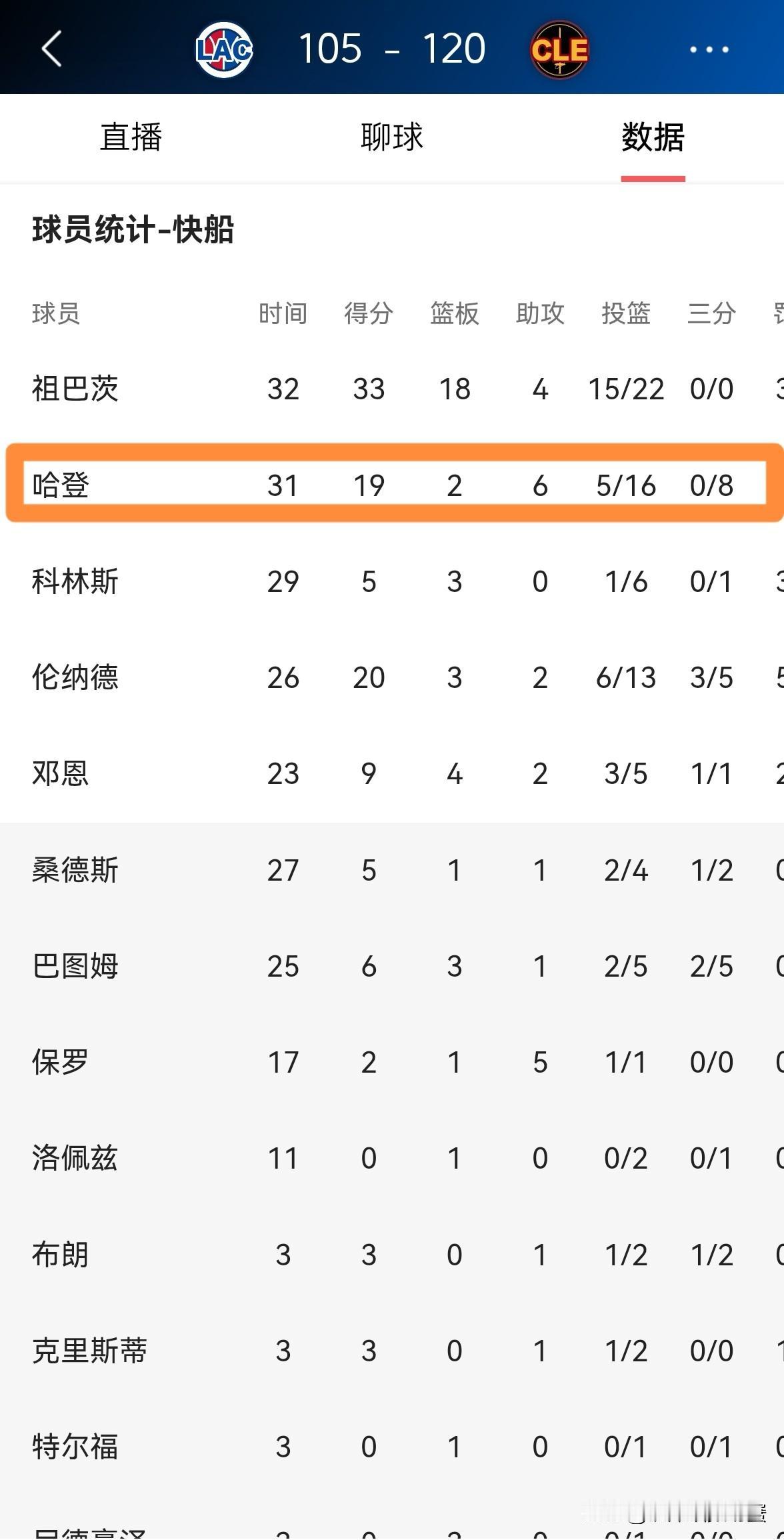 我对快船球星哈登真是忍无可忍了!在今天快船客场以105:120惨败于骑士的比赛中,哈登的表现真是惨不忍睹。 全场比赛下来,哈登首发出战31分钟,投篮16中5,其中三分球8中0、罚球10中9非常低效的得到19分,还出现了3次失误,他的场上正负值为-15。 虽然本场比赛快船是背靠背作战,但是作为球队领袖和核心的哈登,他的表现是无法让人满意的。