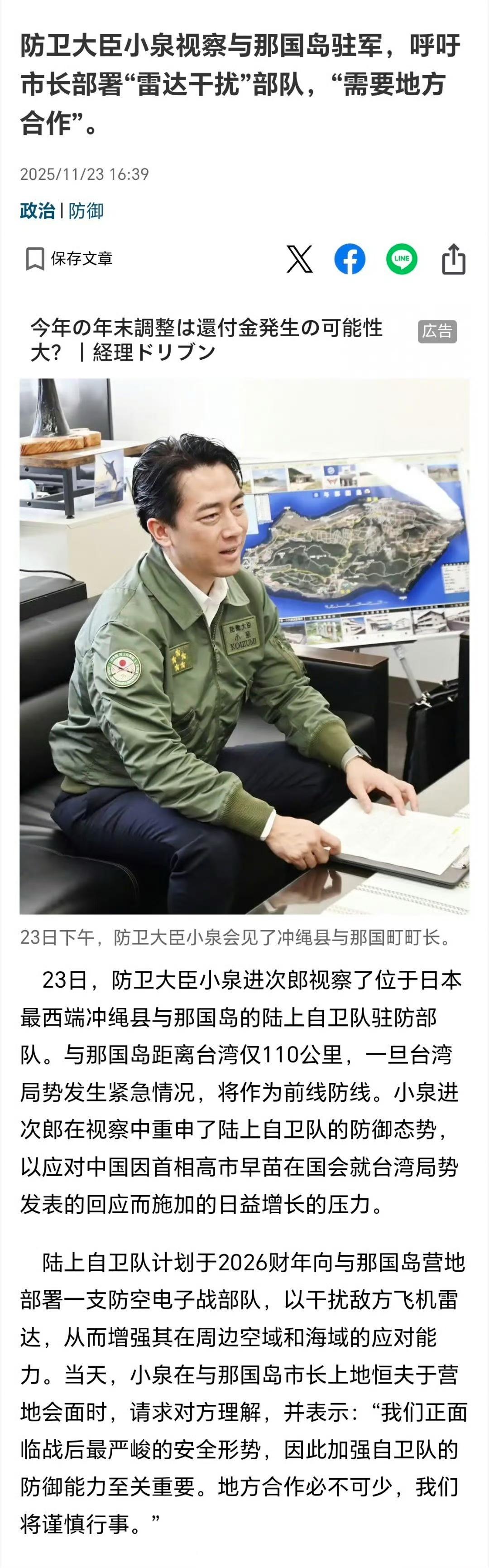 日本防卫大臣小泉进次郎视察与那国岛,推进部署中程导弹计划,这里距离台湾地区约110公里。 日本计划于2026财年向与那国岛营地部署一支防空电子战部队。 由此可以看出,日本不但没有收敛,还在进一步挑衅。反制日本,还得部署导弹,提高对日本压力。