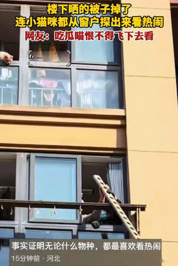 笑不活了!江苏,楼下邻居晒的被子掉了,正在阳台上想各种办法拯救。当听到动静后的小猫立刻跑到阳台窗户探出小脑袋看热闹,猫咪那架势恨不得飞下去去看。网友:事实证明无论什么物种,都最喜欢看热闹! 天气很好楼下邻居把被子拿到阳台晒太阳,结果后来刮起了风,被子就刚好不小心掉在了下面。当邻居发现被子掉了之后,就开始想各种办法,因为这个说这样拿,那个说那样拿,在他们争论之中。 却吵醒了正在午睡的猫咪,猫咪先是锁定了声音来源,然后嗖的一下快步跑到了阳台上,在阳台上它只能听到声音却看不到人。充满好奇心的它直接爬上窗台,然后探出脑袋直接看个究竟。 只见邻居拿来一根长长的棍,然后就往下面够东西。猫咪在楼上看的比他们还清楚,我看急的猫咪可是了不得,它都有点指手画脚想上去帮忙了。它心里肯定想:真服了,不是你那样的,你应该先往左边一点,然后在靠右,这样才对。 那么高猫咪看起热闹来也不说怕了,脖子抻的长长的,恨不得一下子长上翅膀飞下去指挥人类。哈哈哈不过这猫咪真的是好八卦呀,太可爱了! 对于这件事情,大家有什么看法? 信息来源:普陀潮
