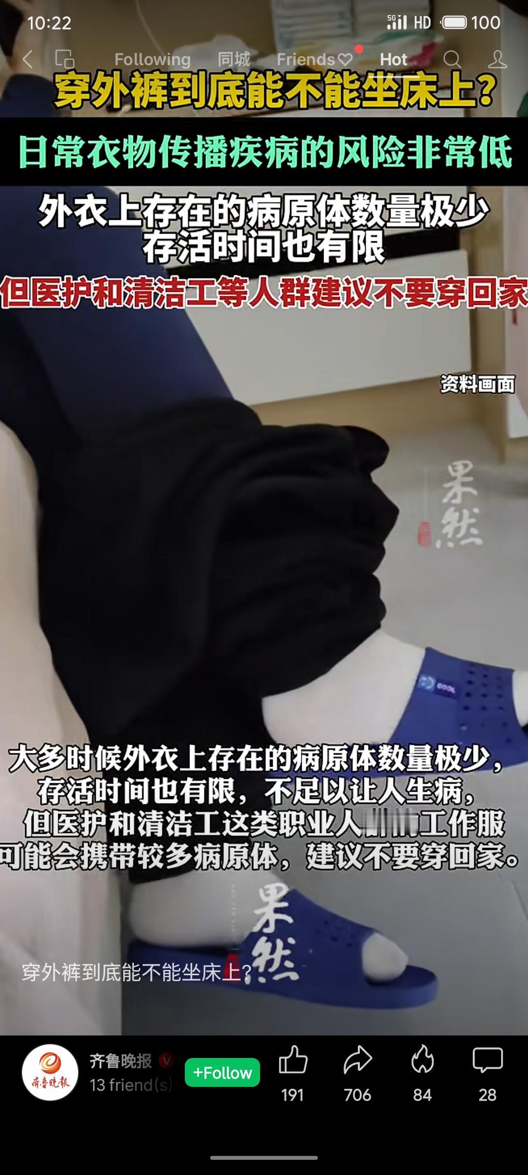 根据央视网报道,日常穿外裤坐床传播疾病的风险很低,因外表病原体数量少、存活时间有限。但医护、清洁工等职业人群的工作服可能携带较多病原体,建议不要穿回家。若家中有免疫力较低或易过敏成员,也建议回家后更换衣物。