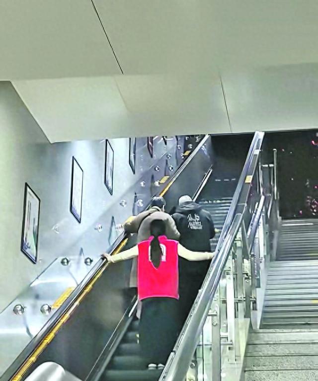 崔婉婷正在默默守护扶梯上的老夫妻。(网友拍摄的照片)