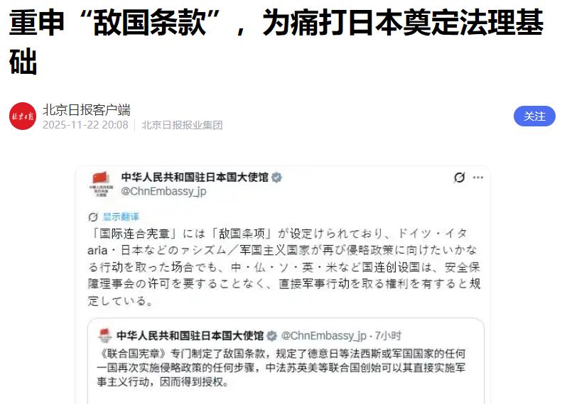 中国使馆援引联合国宪章敌国条款,日本知道着急了,开始做2手准备。 11月21日,中国驻日使馆援引联合国宪章第107条,该条文规定二战战胜国面对战败国再次干涉与侵略,可不经国际法采取军事行动,等于是说在法理上我们是有直接出兵而不必联合国同意的权利的。 这相当于给日本右翼政府划下了一道二战后从未有过的法律红线,还恰好戳中了高市早苗政府近期在台海问题上的激进表态。而面对我方拿出的法律武器,日本立刻摆出了典型的“双面戏码”,嘴上说着对话,身体却很诚实地加速军事部署。 11月22日G20峰会上,内阁广报官小林麻纪一句“涉台立场没有任何改变”说得轻描淡写,但同一时间防卫相小泉进次郎直奔琉球的动作,却暴露了日本的真实意图。 小泉进次郎视察的石垣岛雷达站不是什么普通设施,这座建在海拔500多米于茂登岳山顶的警戒雷达,探测范围直接覆盖台湾岛北部空域,岛上还驻扎着近600人的自卫队力量,包括地空导弹连和岸舰导弹连,最新换装的增程型12式导弹射程已超1000公里,足以对台海东部形成威慑。 而这种“一边喊对话一边架导弹”的操作,完美诠释了什么叫口惠而实不至。若翻开日本近年来的西南诸岛军事化账本,更能看清其两面性背后的长期布局。 从2016年以“局势紧张”为由启动战备建设至今,日本已在宫古岛、石垣岛、与那国岛等关键岛屿砸下数万亿日元,光是2025年防卫预算中就有1200亿日元专门用于“西南应急准备”。 与那国岛距台湾仅110公里,岛上不仅有沿岸监视队,还部署了专门应对电子侦察的部队;宫古岛则建成3座大型机场,驻有720人的警备力量和多型导弹;琉球群岛更是被打造成指挥中枢,计划将第15旅团扩编为4000人的师团。 值得注意的是,日本正忙着在这些岛屿新建130座弹药库,专门储存远程导弹,这种规模的战备建设,哪像是准备“对话”的样子? 我们援引107条是为了警示日本,最终是否出手还是要根据我们自己的政策决定的,可要是日方执迷不悟,那等到未来真被打了,可千万别喊冤!