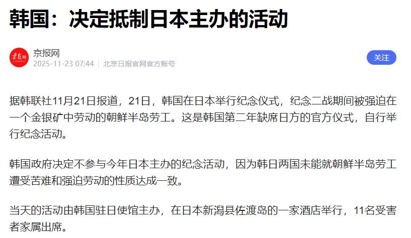 韩国也开始抵制日本的活动了,不得不说,李在明真的很聪明! 11月21日,韩国代表团在日本某地举行了一场特殊的纪念仪式,缅怀二战期间被强制征召到金银矿场劳作的朝鲜半岛劳工。 这场仪式并非日方官方活动的一部分,而是韩国连续第二年选择缺席日方主导的纪念环节,转而自行组织相关活动。现场不仅有韩国政府官员出席,还有劳工幸存者及其家属代表,他们向纪念碑献花鞠躬,气氛庄重肃穆,不少人眼含热泪,场面令人动容。 二战期间,大量朝鲜半岛民众被日本侵略者强征至本土及殖民地的矿山、工厂从事苦役,其中金银矿场的劳动条件尤为恶劣,劳工们遭受了非人的待遇,而这一历史伤痛始终是韩日关系中的敏感议题。 2018年,韩国最高法院曾对部分日本企业强征劳工案作出判决,要求相关企业向受害者支付赔偿金,但日方以“战后赔偿问题已完全解决”为由拒绝执行,韩国民众显然是不满的。 外加上近期日本还就独岛问题挑衅韩国,这让韩国民众不满的情绪进一步升温。 外加上高市早苗弄坏了中日关系,韩国便有意跟日本进行切割,不再强调韩日同盟和友好。李在明领导的韩国政府此次坚持自行举办纪念仪式,正是这种态度的直接体现。 从政治层面来看,这一举措既回应了国内民众对历史正义的强烈诉求,也有助于凝聚民心。毕竟,正视历史、维护受害者权益是韩国社会的普遍共识,政府的这一行动自然能获得广泛支持。 除了历史问题之外,韩日在贸易领域的争端、军事合作上的分歧等都让两国关系持续紧张。 韩国此次缺席日方官方仪式,自行开展纪念活动,也是在向日本传递一个明确信号:在历史问题得到妥善解决之前,韩日关系难以回到所谓的“友好同盟”轨道。 韩国外交部发言人在仪式后表示,“维护历史正义是政府的基本立场,我们将继续为受害者争取应有的权益”,这番表态更是印证了韩国在历史问题上的强硬态度。 韩国的这种做法其实并非偶然,尹锡悦下台之后,韩国在处理与日本的历史遗留问题上愈发坚定,不再像过去那样为了所谓的“同盟利益”而妥协。而通过自行举办纪念活动,韩国不仅展现了对历史的尊重,也在国际社会面前凸显了自身的立场。 这种既符合国内民意又能重塑外交格局的举措,不得不说李在明政府确实有着清晰的政治考量。