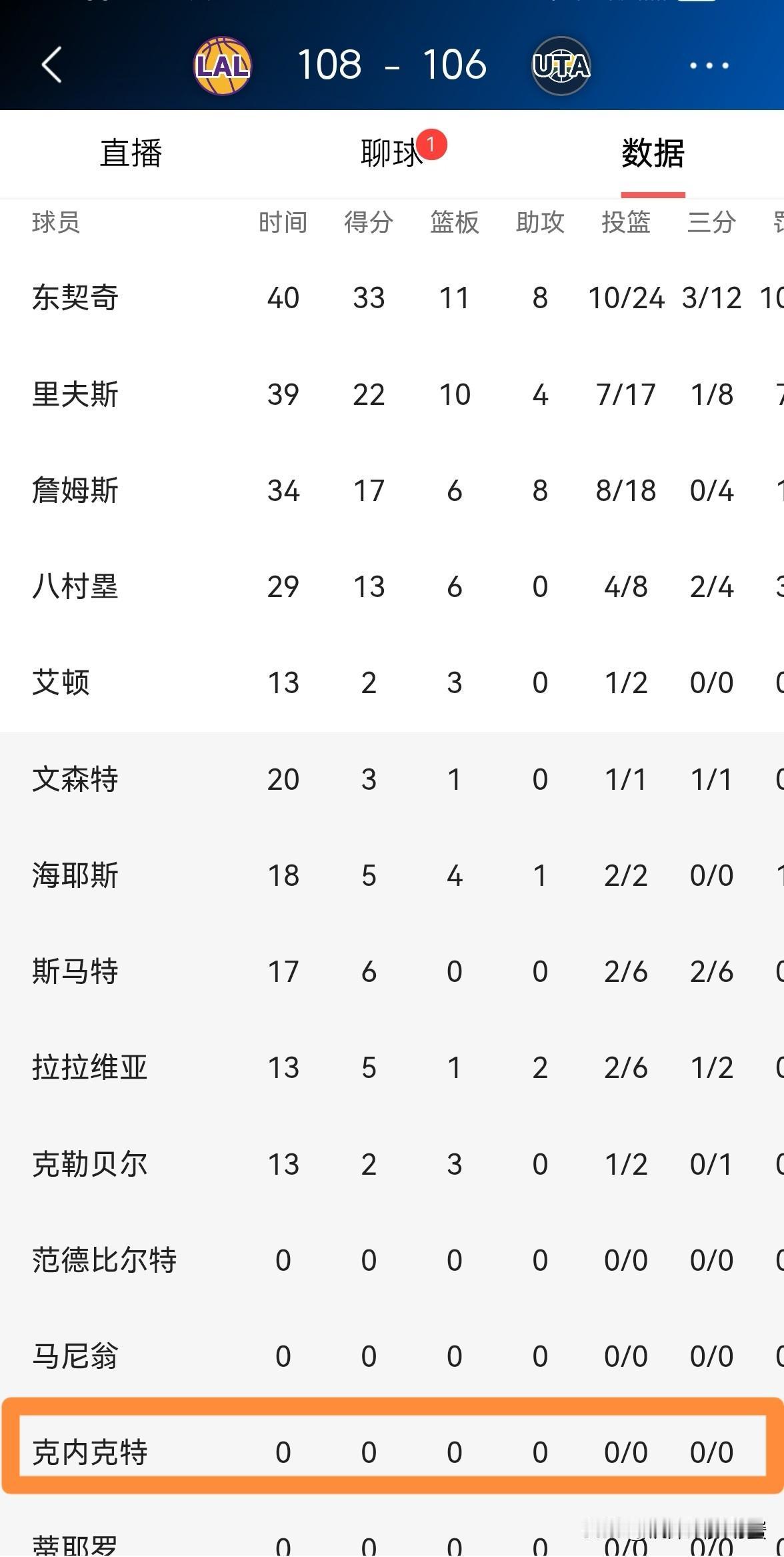 湖人超级新星克内克特真是彻底的失宠了!在今天湖人客场以108:106险胜爵士的比赛中,克内克特惨遭主帅雷迪克的弃用,全场比赛下来克内克特没有获得出场机会,坐了一整场的冷板凳。 值得一提的是,本场比赛雷迪克教练宁可启用克勒贝尔也没有让克内克特上场,由此可见克内克特已经彻底的跌出了球队的轮换阵容。