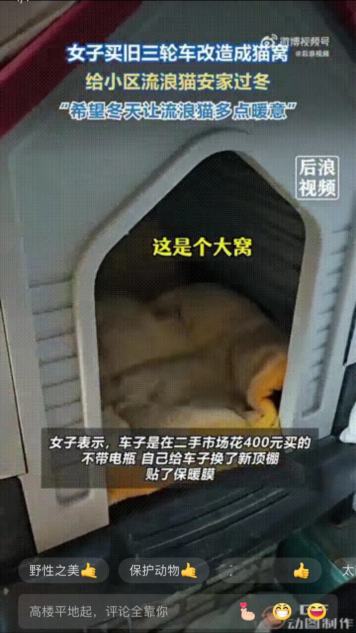 太有爱了! 河南一位女子发现小区里出现了很多流浪猫,眼看天气越来越冷,为了让流浪猫可以顺利过冬,于是她花400元在二手市场买了一辆三轮车,然后自己亲手改造成流浪猫的家,让它们可以上车休息,这辆三轮车买来的时候不带电瓶,女子给车子换了新的顶棚。 视频里的改造过程看得人心里暖暖的!女子说,刚发现小区里的流浪猫时,它们总蜷缩在垃圾桶旁或车底下,尤其是清晨和夜晚,气温降到零下,小猫们冻得缩成一团,有的还在瑟瑟发抖。她看着心疼,就想着得给它们找个遮风挡雨的地方,逛了好几家二手市场,才淘到这辆八成新的三轮车,400块钱花得一点不心疼。 谁能想到,一辆不起眼的二手三轮车,在她手里慢慢变成了流浪猫的“豪华公寓”。买来时车斗锈迹斑斑,顶棚也破了好几个洞,她先找师傅给车斗做了除锈处理,又自己网购了防水帆布,踩着凳子一点点把旧顶棚换下来。为了让小猫们睡得暖和,她把家里不用的旧棉被、旧毛衣拆了,剪成合适的大小铺在车斗里,还特意做了几个分隔小格子,怕有的小猫抢地盘打架。 车斗侧面她还开了几个通风口,既保证空气流通,又不会让冷风灌进去。改造完成后,她把三轮车停在小区里人流少、背风的角落,又在车门口放了一碗清水和猫粮。第一天晚上,她特意绕到车旁查看,发现三只小猫已经蜷缩在棉被上睡着了,脑袋挨在一起,样子乖巧极了,她忍不住掏出手机拍了下来,嘴角一直带着笑。 女子说,改造花了整整三天时间,每天下班回家就扎进车库忙活,手上磨出了两个小茧子,换顶棚时还不小心蹭到了胳膊,但看到小猫们愿意住进去,所有辛苦都值了。“它们也是一条条小生命,冬天这么冷,总不能眼睁睁看着它们受冻。”她还特意嘱咐小区里的邻居,要是看到小猫上车休息,别驱赶也别破坏,大家都很支持她的做法,有的邻居还主动拿来家里的旧衣物,让她给小猫们加厚铺垫。 400块钱,买不来名贵的宠物用品,却能买来实实在在的温暖!想想很多人遇到流浪动物,要么视而不见,要么嫌它们脏、怕它们伤人,可这位河南女子却用行动诠释了什么是真正的善意。她没有因为流浪猫不是自己养的就漠不关心,也没有因为改造麻烦就半途而废,这份发自内心的柔软,比任何华丽的辞藻都更有力量。 网友们看完视频,纷纷留言点赞:“这才是冬日里的小温暖!为善良的小姐姐点赞”“400块+一双巧手,给流浪猫一个家,太有意义了”“希望更多人能善待流浪动物,它们要的不多,只是一个遮风挡雨的地方”。还有同城网友说,自己小区也有流浪猫,看完这个视频也想学着改造一个“猫屋”,让小动物们能安稳过冬。 其实这些年,关于流浪动物过冬的问题一直被关注。很多城市的民间救助组织会搭建临时猫屋、狗屋,但个人主动花时间花钱改造“移动猫屋”的并不多。这位女子的做法,不仅解决了小区里流浪猫的过冬问题,更给大家提了个醒:善待流浪动物不需要多么昂贵的付出,只要有一份爱心,就能给它们带来希望。 有人可能会说“流浪猫太多,管不过来”,但善良从来不是“非黑即白”的选择题。你可以不喜欢,但请不要伤害;你可以没精力救助,但请尊重那些愿意伸出援手的人。这位河南女子用一辆三轮车证明,平凡人也能做不平凡的事,小小的善举,就能汇聚成大大的温暖。 改造后的三轮车成了小区里一道特殊的风景,每天都有小猫在里面休息、进食。女子还会定期清理车斗里的杂物,更换干净的棉被和猫粮,她说只要这些小猫能顺利过冬,她就会一直坚持下去。有时候她下班回家,还会蹲在车旁和小猫们说说话,小猫们也不怕她,会凑到她手边蹭一蹭,那份信任,是对她善良最好的回报。 善良从来都不是一时兴起,而是发自内心的选择。这位河南女子的行为,让我们看到了人性的美好,也让我们明白,关爱流浪动物,不仅仅是救助一条生命,更是在守护社会的温情。在这个寒冷的冬天,一辆改造后的三轮车,不仅给流浪猫带来了温暖,也给我们每个人的心里带来了暖意。 各位读者你们怎么看?欢迎在评论区讨论。
